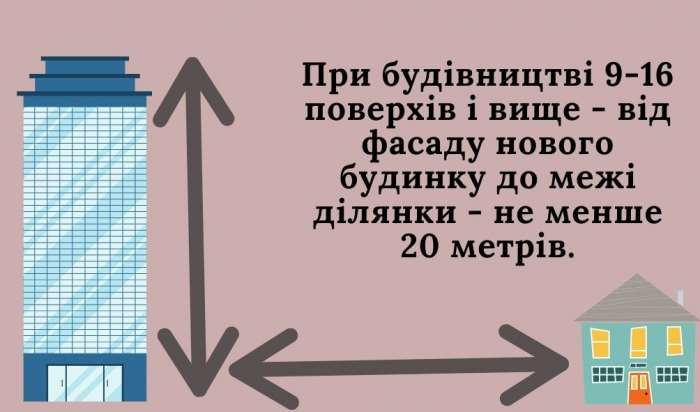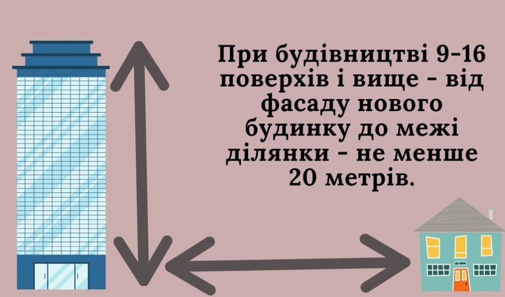 При строительстве 9-16 этажей и выше — расстояние от фасадов нового дома в границы земельного участка должна быть не мене 20 метров.