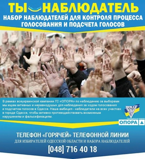 В рамках всеукраинской кампании ГС «ОПОРА» по наблюдению за местными выборами-2015 одесский КИУ ищет активных и неравнодушых одесситов для наблюдения за ходом голосования и подсчетом голосов в Одессе 25 октября. Наша цель — наблюдатели на всех участках в городе Одессе, чтобы активно противодействовать возможным нарушениям и фальсификациям. Просим всех заинтересованных зарегистрироваться в онлайн форме. http://bit.ly/1JTwVdd С дополнительными вопросами можно обращаться на горячую линию Одесского КИУ: (048) 716-40-18