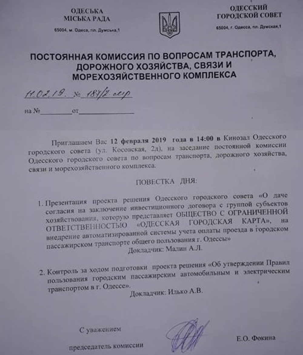 1. Рассмотрение проекта «О даче согласия ООО «Одесская городская карта» на заключение инвестиционного договора на внедрение автоматизированной системы учёта оплаты проезда в городском пассажирском транспорте».