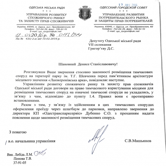 На этом история только начинается, я подал соответствующие запросы в «Управление Торговли» и в КП «Ланжерон», но чуда не произошло, я оказался прав. В рамках проверки КП «Побережье» (екс-кп «Ланжерон») выяснились следующие факты: