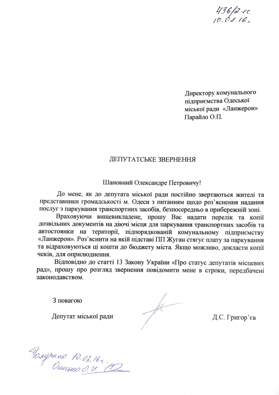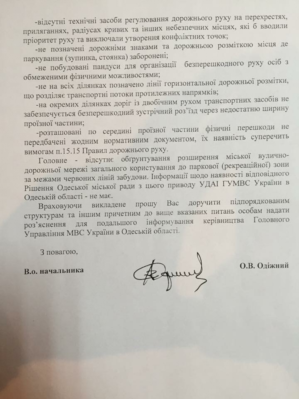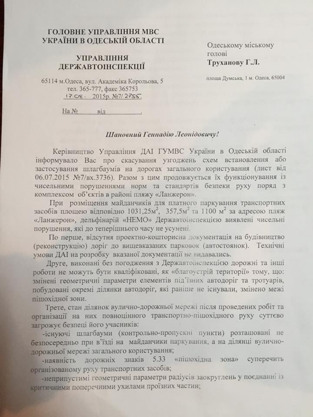 Я с Александр Борняков и Дмитрий Палпатин, осуществляли проверку КП «Ланжерон». После обследования территории, с нас потребовали деньги за выезд с территории парка, что якобы там вся территория — это парковка. После продолжительное беседы с «повелителем шлагбаума», он нас выпустил (во-первых это не законная парковка, во-вторых это рабочий визит), не взяв деньги.