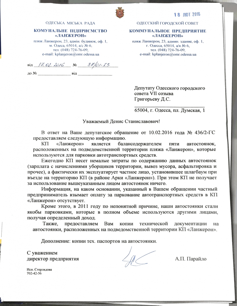 2. КП Ланжерон, является балансодержателем пяти автостоянок, расположенных на подведомственной территории пляжа «Ланжерон», которые используются для парковки автотранспортных средств. КП — содержит данную территорию и оплачивает все сборы, а частный предприниматель, ее просто сдает в аренду, заключив договор с парк-сервис (на каком основании — спросите у парк.сервиса)