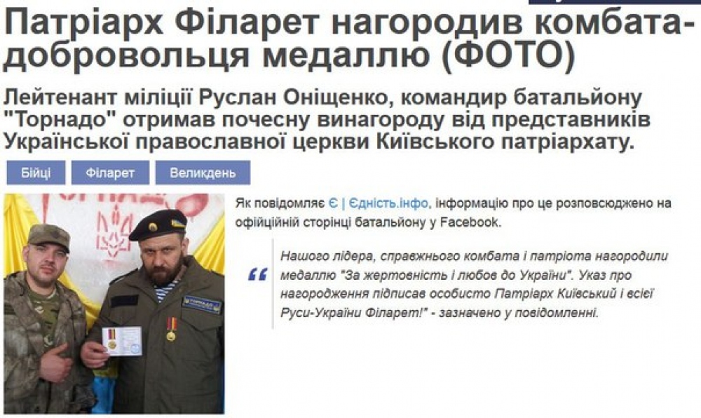На Пасху «патриарх» Филарет наградил комбата «Торнадо» Руслана Онищенко медалью «За жертовність і любов до України». А уже через 2 месяца его арестовали, батальон расформировали. Совпадение? Не думаю.