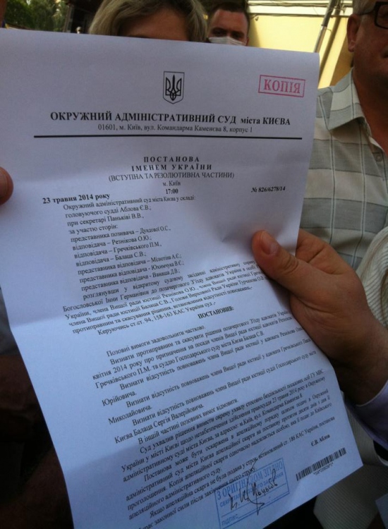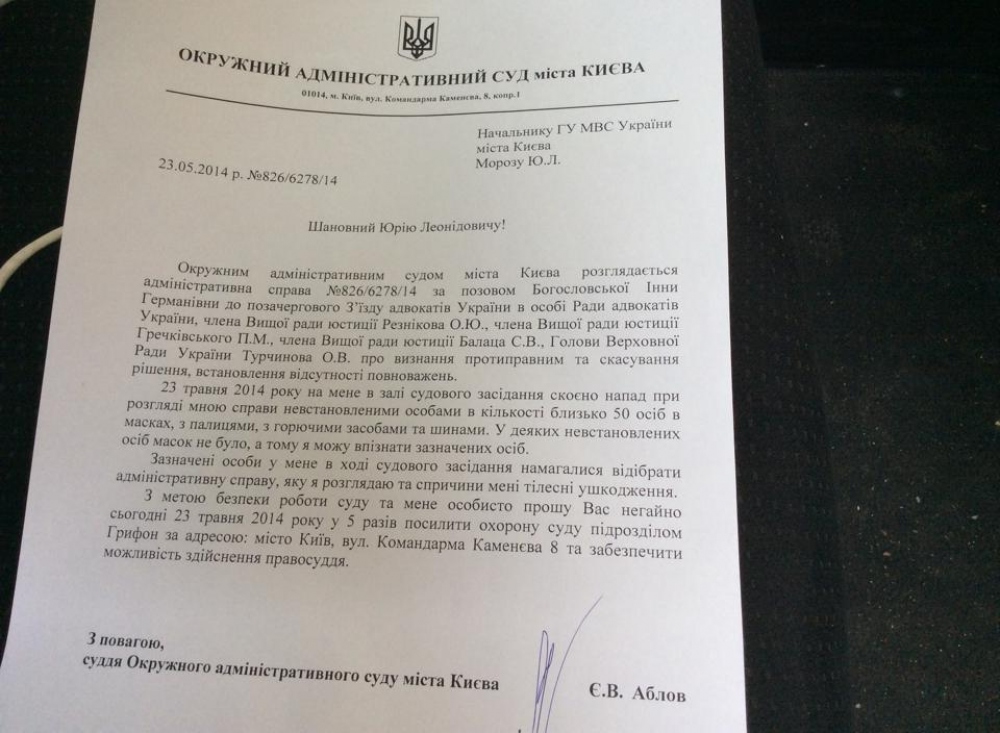 Судья из Одессы в Окружном административном суде г Киева Евгений Аблов — удовлетворил частично иск Инны Богословской и отменил решение внеочередного съезда адвокатов Украины прошедщего в Одессе 26-27 апреля, о назначении на должности членов Высшего совета юстиции Резникова А.Ю., Гречковского П.Н и судью Балаца С.В. Национальная ассоциация адвокатов Украины — намерена подавать апелляционную жалобу. Кроме того, судья Аблов заявил что в ходе судебного рассмотения на него было совершено нападение со стороны 50-ти неизвестных. В одессе Евгений Аблов известен периодом своей работы в Одесском окружном административном суде земельным делом о «Затоке» (http://ord-ua.com/2012/01/17/zheka-20-vidsotkiv-3/) и участием рассмотрения исков по Одесским эвакуаторам Горсовета при Э. Гурвице в виде ООО «Паркинг люкс» в 2008 году. |