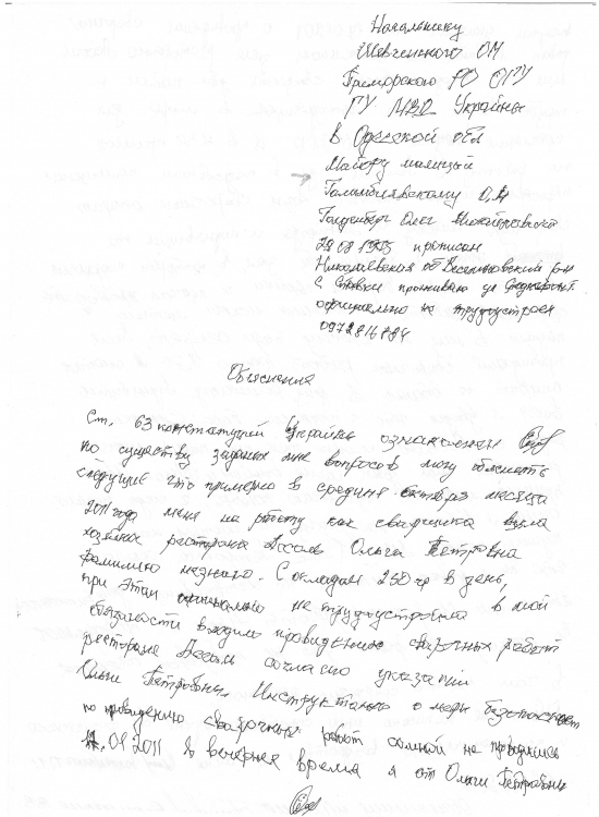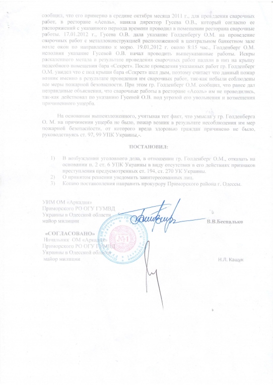 И вот вроде работали, нашли причину, но нет, она многих в этом городе не устроит, как это так просто сварщик это никому не нужно, нужен поджег, только тогда можно поднять много шума, привлечь к себе внимание, сказать что обижают честных предпринемателей и стать во главе колонны идущей на битву с несправедливостью. А на самом деле людей работающих и выполняющих свои обязанности, плохо или хорошо пусть рассудит общественность, просто выбрасывают на улицу как надоевших щенят. Так вот после вчерашней публикации документа сотрудников аркадийского райотдела уволили из органов задним числом. Хотя они к публикации данного документа не имеют никакого отношения. Со слов развитие событый с участием сварщика очень не выгодно госпоже Гусевой О.П. и она путем поощрений вышестоящего руководства или каким либо другим путем добилась отстранения обычных сотрудников милиции которые в общем то ни в чем не виноваты, они просто выполняли свою работу.