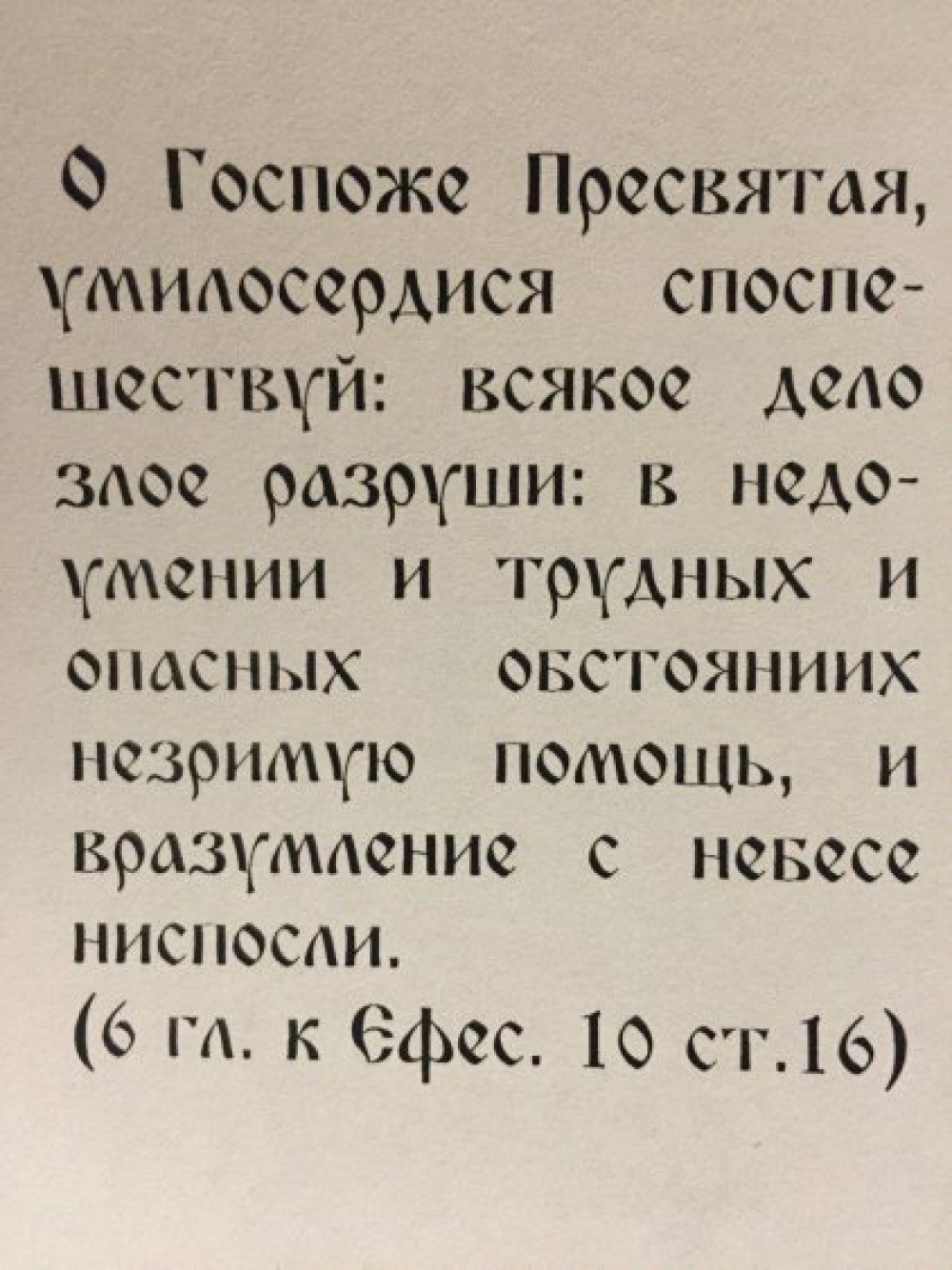 В Одесском женском монастыре произошло чудо. Накануне Покрова Божьей Матери монахиня Феофила читала ночью Писание – 6 главу Апостола Павла к Ефесянам. Вдруг в книге на стихах 10-16 она увидела новые, незнакомые слова: «О, Госпоже Пресвятая, умилосердися, споспешествуй. Всякое дело злое разруши. В недоумении, трудных и опасных обстояниях незримую помощь и вразумление с небесе ниспошли.»