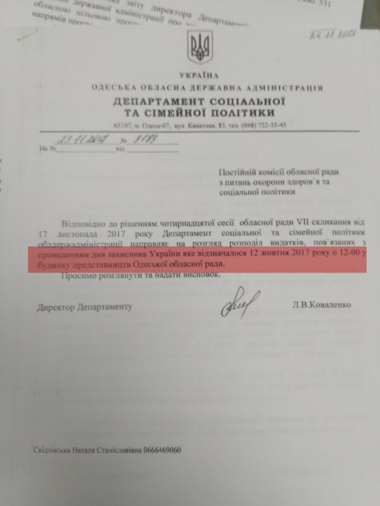 А ТЕПЕРЬ ВНИМАНИЕ. День защитника отмечается 14 октября. Торжество ОГА провела 12 октября в 12.00 в доме приемов. Но на эту дату на департамент были посажены только 548 тысяч гривен на праздники, которые уже на тот момент, судя по опубликованным на сайте ОГА распоряжениям губернатора, были израсходованы. Сессия внеочредная была только 17 ноября…