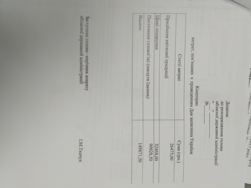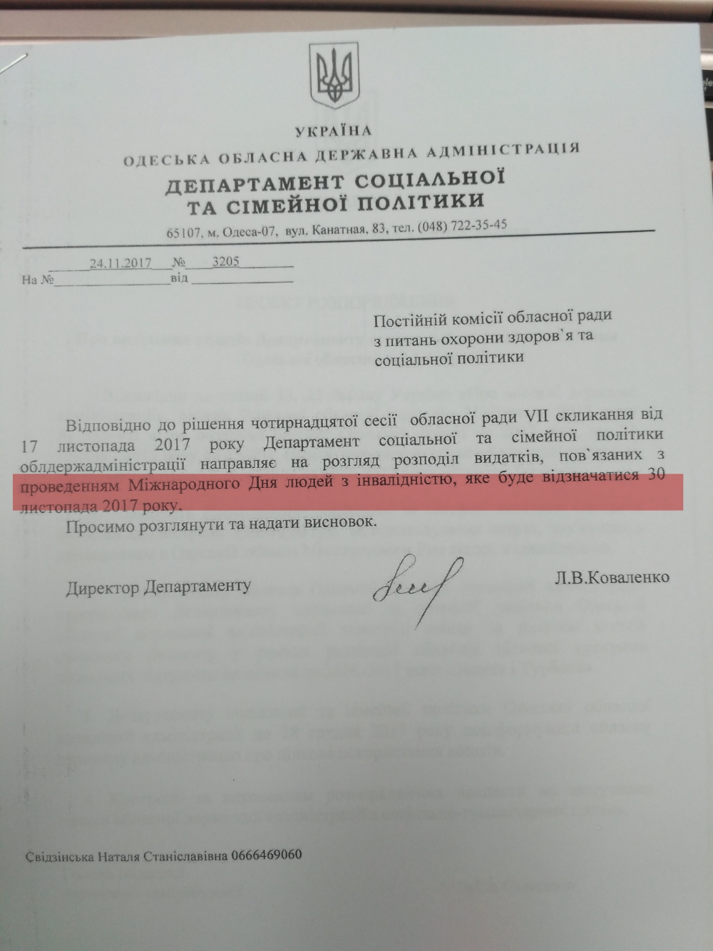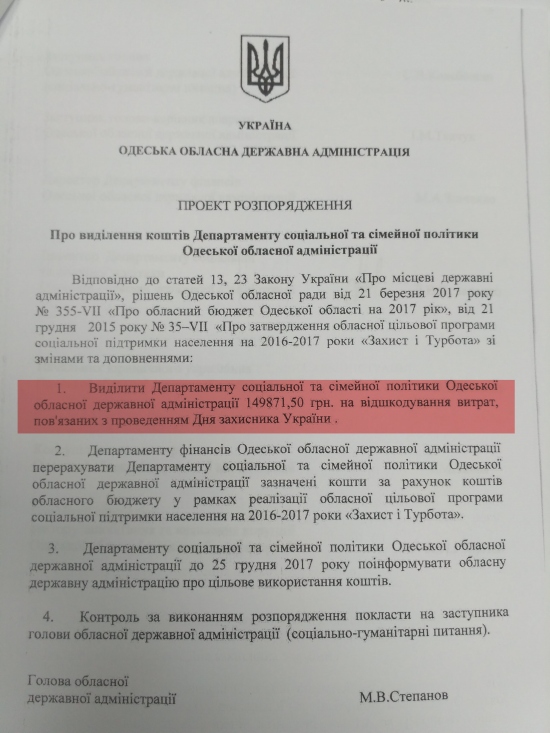 Не успели высохнуть чернила под решением облсовета об изменениях в программу «Захист и Турбота», в том числе в части согласования с профильной комиссией расходов по добавочным 600!!! тысячам гривен на праздники к уже имеющимся 548 тысячам, как департамент социальной и семейной политики оперативно подготовил два проекта распоряжения губернатора по двум праздникам: 1. День защитника Украины и 2. Международный день людей с инвалидностью.