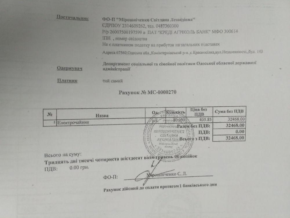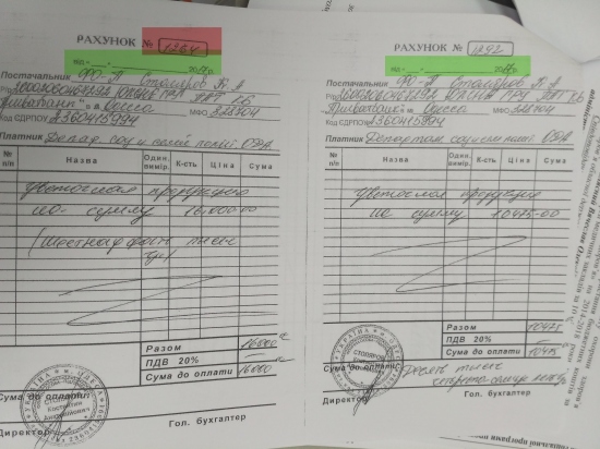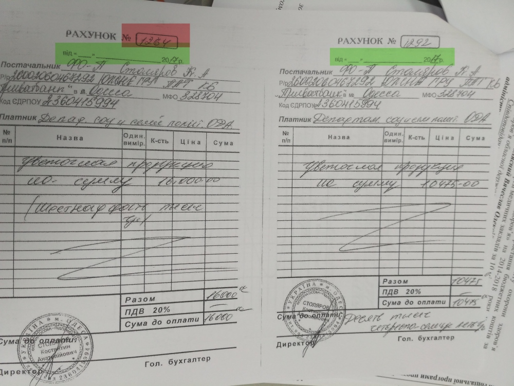 Неужели ФОП «Мірошніченко Світлана Леонідовна» наперед выдала департаменту (а иначе как бы их вручили виновникам торжества) 80 электрочайников по 405, 85 грн за штуку? А ФОП «Cтоляров Костянтин Анатолійович» выдал к 12 октября наперед цветочной продукции на 26, 5 тысяч гривен? Кстати, судя по предоставленным департаментом счетам от этого «цветочного» ФОП Столярова, он даже не заморачивается по номерам счетов: под одним и тем же номером 1264 выписаны ДВА счета на две разные суммы – на 26 и на 16 тысяч. Наверное, совпадение…