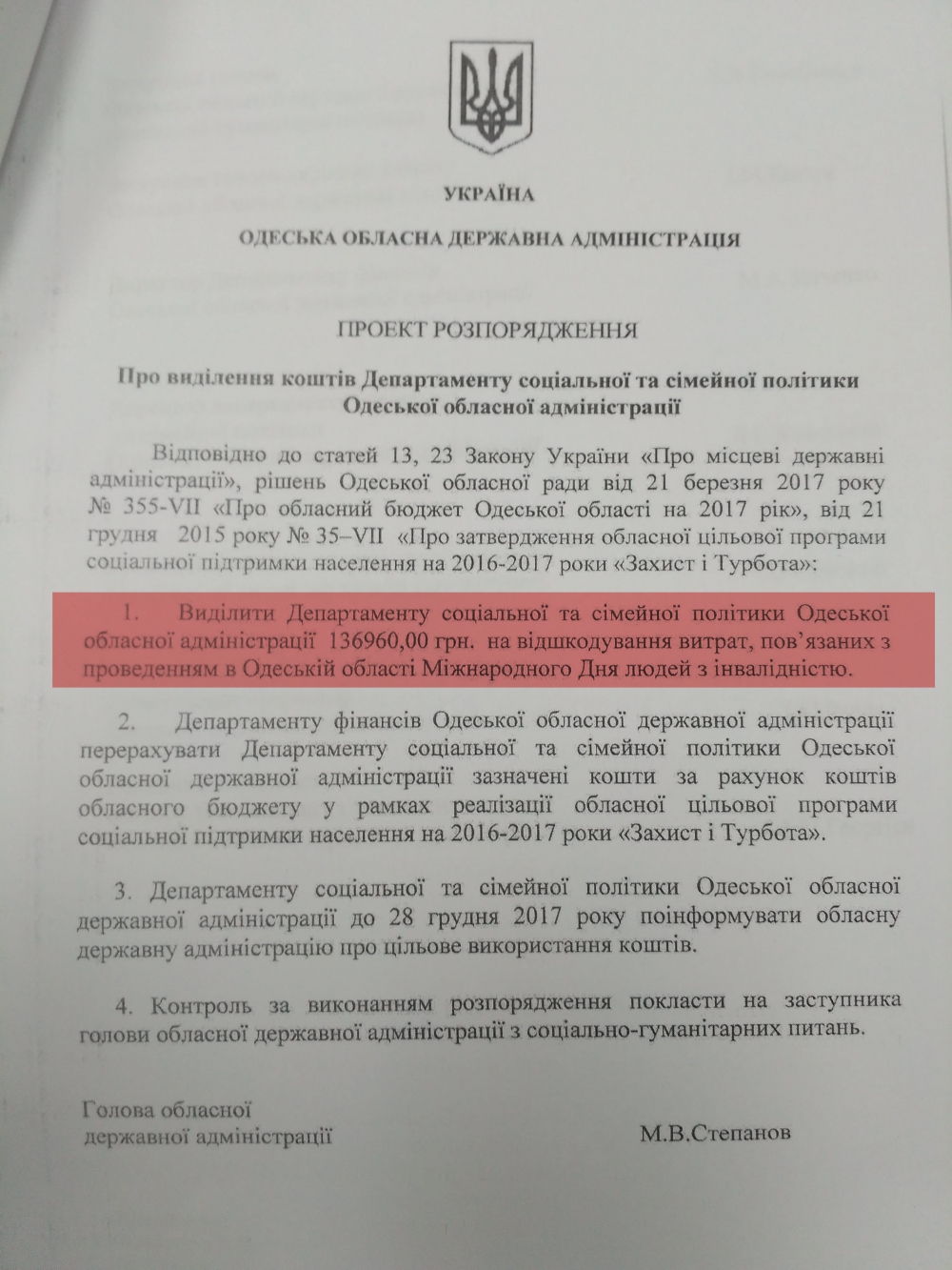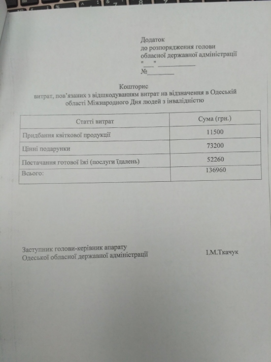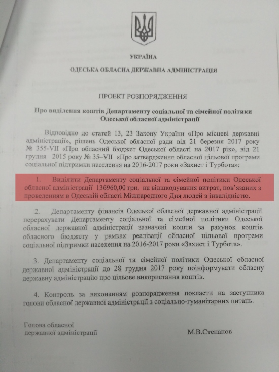 И проект распоряжения того, как на торжество с участием первых лиц области в доме приемов для людей с инвалидностью планируют потратить еще почти 140 тысяч гривен.