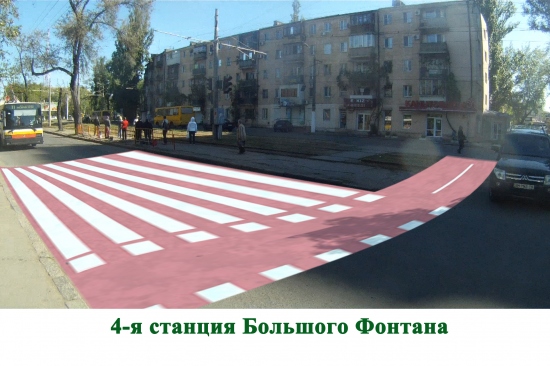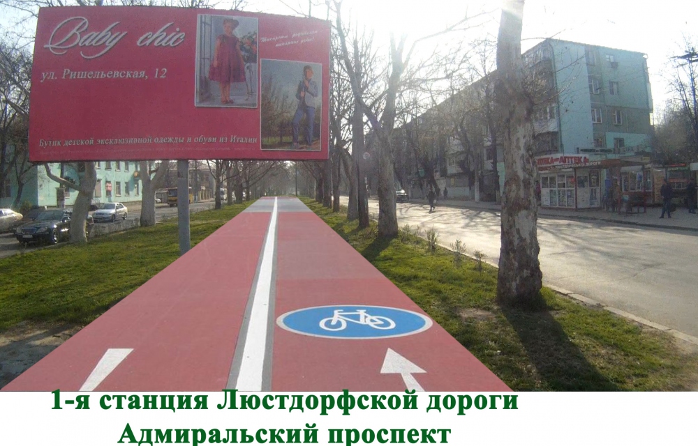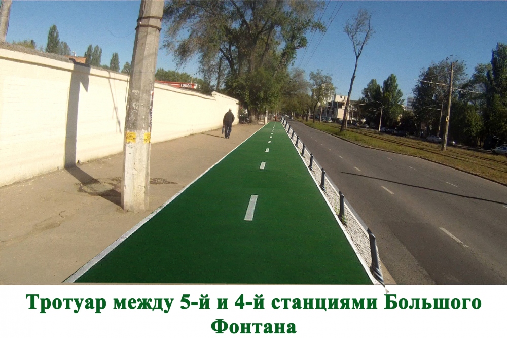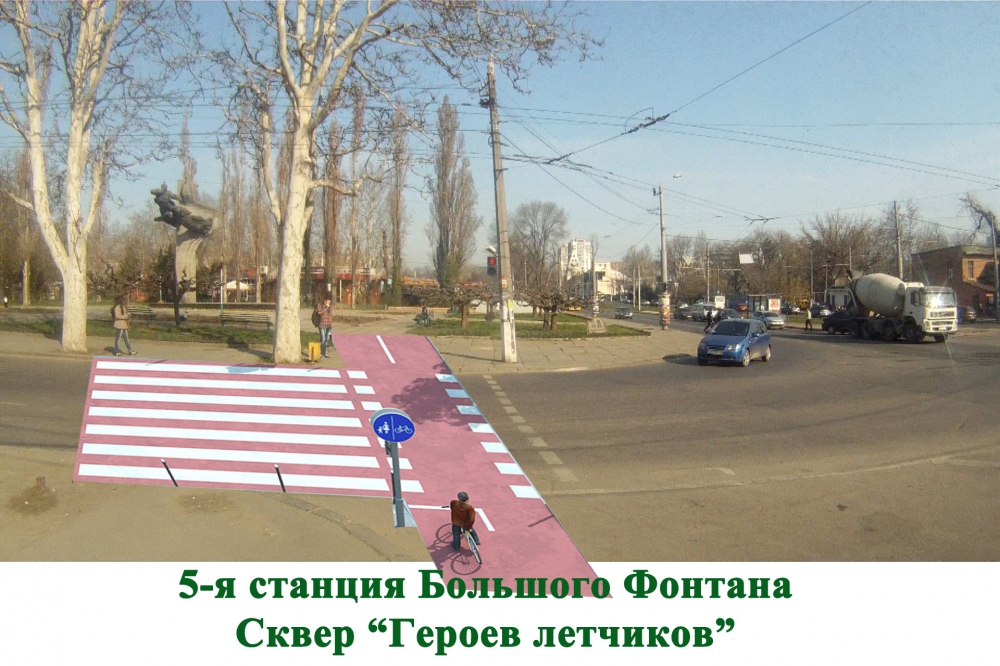 Таирово -Фонтан 4-2Для этого маршрута необходимо забыть про основные транспортные магистрали, с помощью которых мы привыкли добираться с Таирово и обратно. Привычные нам улицы Люстдорфская Дорога, Королева и Маршала Жукова до предела насыщены транспортом, тротуары освоены, застроены и прокладка велодорог там возможна только в комплексе с глобальной реконструкцией этих улиц. У велосипедистов есть эксклюзивное право выбора, и мы выбираем путь не самый короткий, но зато самый комфортный и живописный. Стартуем от панорамы по Проспекту Глушко в сторону 7-й станции Люстдорфской Дороги. Разделительная полоса проспекта позволяет наростить по метру пространства с каждой стороны без ущерба для движения автомобилей. На 7-й станции определяем полосу для кругового движения и выезжаем на ул. Львовскую. На этой улице выделяем по обе стороны полосу совместного с автомобилями движения, и выезжаем на 13-ю станцию Большого Фонтана. Прибрежная полоса, возможность отдохнуть и подышать морским воздухом, ради этого стоило проехать лишний километр. От 13-й до 12-й станции достаточно просто выделить полосу на проезжей части и исключить возможность парковки автомобилей. Далее выезжаем на хорошую качественную Фонтанскую Дорогу, на которой выделяем полосу совместного использования. Двигаемся по Фонтанской Дороге, не забывая, что практически на каждом перекрестке можно свернуть и попасть на море. Доезжаем до 9-й станции, небольшой сквер с фонтаном дает возможность отдохнуть уставшему велосипедисту. Далее следует сложный участок между 9-й и 5-й станциями Большого Фонтана. Проезжая часть перегружена автомобильным и общественным транспортом, тротуары предусмотрены очень широкие и на некоторых участках хорошо подходят для велодороги, но есть места, где тротуары уже глобально освоены и прокладка велодорожки ударит по чьим-то интересам. Кроме обычных МАФов необходимо решать вопрос с рынком на 6-й станции. Есть несколько инновационных идей решения велодорог на данном участке, но озвучены и выдвинуты на обсуждение они будут позже, оставим этот участок для следующих этапов строительства велосипедной инфраструктуры. Итак, велодорога с Таирова через Фонтан немного ломает мировоззрение, но по совокупности факторов этот путь является наилучшим из всех возможных.Фонтан-Центр 2-1Сквер Героев Летчиков, к нему примыкает тротуар не вполне широкий, но подходящий для движения на велосипеде. Ряд столбов и деревьев проходит по тротуару на расстоянии 80-100 см. от бордюра проезжей части. Увеличиваем тротуар за счет переноса бордюрного камня на 1 — 1, 5 м. в сторону проезжей части и у нас получается комфортная велодорога. С одной стороны она отделена от пешеходной зоны рядом деревьев, с другой стороны от проезжей части бордюром, который к слову необходимо значительно поднять по отношению к проезжей части, чтобы исключить возможность парковки автомобилей. Для автомобилей этот метр пространства не играет никакой роли, два полноценных ряда для движения как были, так и остаются, никто даже не заметит «украденный» метр. Сейчас на этом пространстве в основном припаркованы автомобили Военной Академии, будем надеяться, что в этом ВУЗЕ отнесутся с пониманием и оборудуют для своих автомобилей цивилизованный паркинг, территории у них для этого предостаточно. А вдруг наличие вел