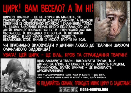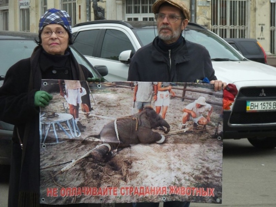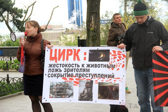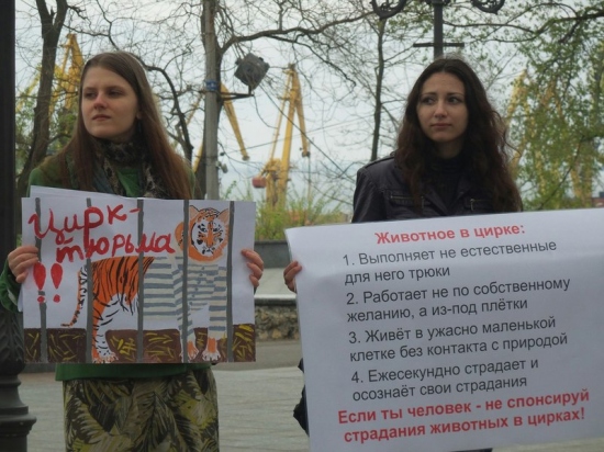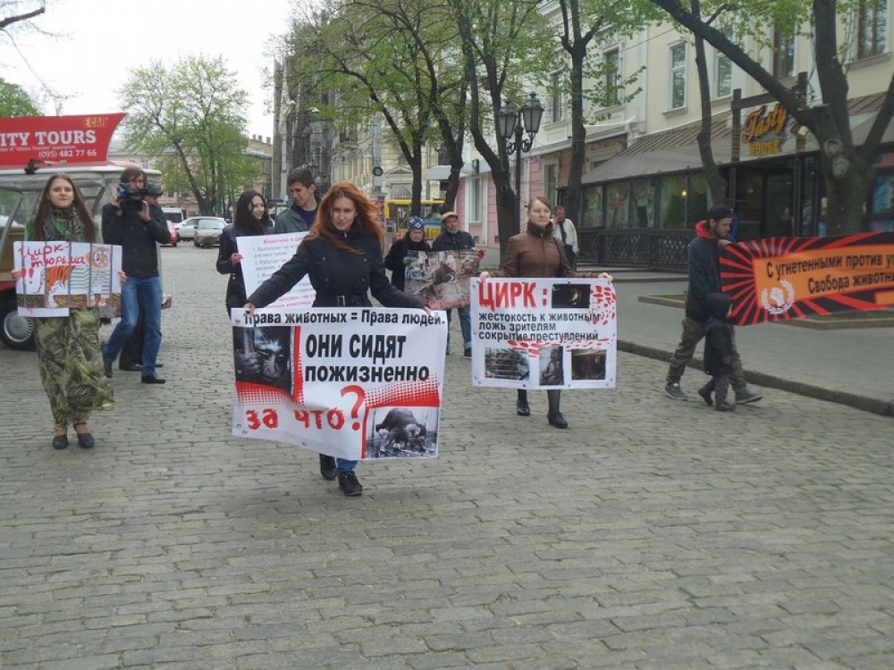 18 апреля, одесские защитники животных организовали небольшую импровизированную акцию на Дерибасовской улице, выступая против эксплуатации животных в цирках и развлекательных шоу. С плакатами в руках, где были изображены драматические кадры из жизни животных в неволе, протестующие раздавали листовки и призывали любителей цирковых представлений не оплачивать шоу с участием животных.