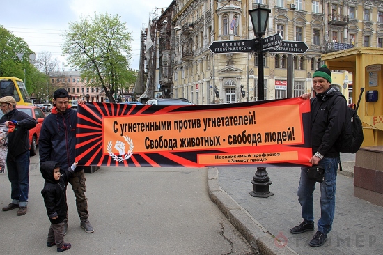К акции одесских зоозащитников присоединились также активисты независимого профсоюза «Захист праці». Они говорят, что эксплуатация животных тесно связана с эксплуатацией людей и природы вообще. Для членов профсоюза борьба с издевательствами над животными неразрывно связана с борьбой против безудержной варварской эксплуатации человека.