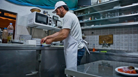 Он разрешает снимать везде, даже в святая святых — кухне. Повар сначала напрягается, но быстро привыкает. Готовит нам хорьятики (греческий салат), мусаку и еще что-то с баклажанами. А да, еще саганаки — любимый жареный сыр.