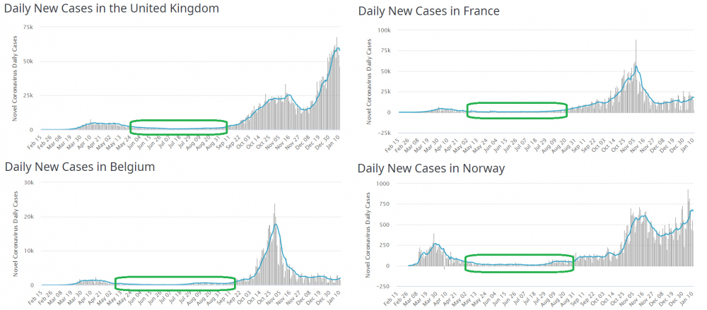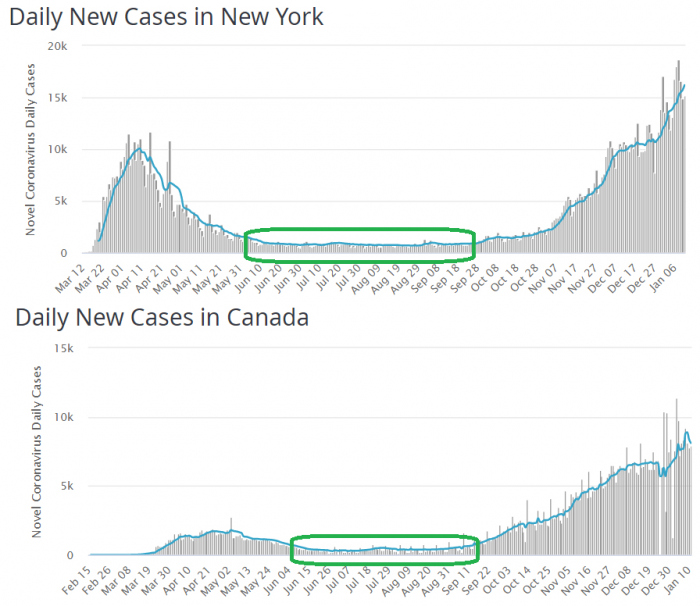 Друзі, хочу вас привітати. У грудні минулого року розпочалася масова вакцинація проти COVID-19 в найбагатіших країнах світу, зокрема в Європі, США, Канаді. Вакцину вже отримали мільйони людей. Україна не належить до найбагатіших країн світу. Вакцин у нас наразі немає, не враховуючи контрабандний товар. На що нам тепер чекати, і що нам зараз робити? Поспішати чи зачекати? «Щепитися чи не щепитися»? ТРІШЕЧКИ ІСТОРІЇ Для початку варто подивитися на події минулого року. У розвинених країнах північної півкулі, де переважно живе той «золотий мільярд», що може дозволити собі вакцину в першу чергу, пандемія розвивалася приблизно однаково. Вірус потрапляв до цих країн у лютому-березні, пік смертей прийшовся на квітень. У травні почалося падіння. Влітку захворюваність і кількість померлих зменшилася в десятки, інколи у сотні разів, до поодиноких випадків. Новий підйом розпочався у вересні-жовті, кількість померлих у десятки разів збільшилася. Відбувалося все це одночасно в різних країнах, від Полярного круга і до тропіків, і приблизно за однаковим сценарієм. Ось, наприклад, як виглядають графіки виявлення нових випадків в чотирьох дуже різних країнах Європи: Як бачите, влітку «вірус пішов у відпустку» скрізь: і в північній Норвегії, де протиепідемічні заходи були мінімальні, і в Бельгії, де кількість померлих була найбільшою, і у теплій Франції, і в туманному Альбіоні. Така ж ситуація була у середніх широтах Північної Америки. Ось графіки для Канади і американського штату Нью-Йорк: Такі дані дають підставу для обережного припущення, що новий коронавірус (принаймні в розвинутих країнах північної півкулі) має певну сезонність — власне, як багато інших збудників респіраторних хвороб. Схоже, що для COVID-19 ця сезонність є навіть більш чітко визначеною, ніж, наприклад, для грипу. Так, в Західній Європі та на півночі США влітку кількість захворілих знизилася в десятки, а померлих — інколи навіть в сто разів у порівнянні з квітнем. І головне: є підстави очікувати, що цією весною та влітку картина буде принаймні схожою. ЩО БУДЕ ДАЛІ Якщо все буде йти так, як відбувається зараз, то в січні-лютому в багатих країнах прищеплять більшість людей з груп ризику першою дозою, у лютому-березні — другою. Якщо все буде так, як обіцяють виробники вакцин, то десь у березні-квітні всі (чи майже всі) ці люди отримають антитіла. Це чудово — є шанси сподіватися, що ці люди отримають захист від небезпечної хвороби. Потім у квітні, як і минулого року, почнеться очікуване сезонне зменшення кількості випадків та смертей від коронавірусу — в десятки та сотні разів. Це відбудеться в будь-якому разі, незалежно від вакцинації, — але, без сумніву, це зменшення будуть подавати як успіх масових щеплень. ЩО БУДЕ ЩЕ ДАЛІ А далі буде ще більш цікаво. Лікарі кажуть, що захист від COVID-19 після перенесеної хвороби триває 6-8 місяців. Чи можна очікувати, що після вакцинації він буде більш тривалим і більш ефективним? Наразі я не вбачаю для цього жодних підстав. Після відносно спокійного літа, у вересні-жовтні в північній півкулі почнеться черговий холодний сезон. На той час після вакцинації, що триває зараз, пройдуть ті самі 6-8 місяців. Тобто люди з груп ризику, яких зараз масово вакцинують, увійдуть у новий коронавірусний сезон без захисних титрів антитіл, тобто, схоже, без жодного захисту. Тому восе