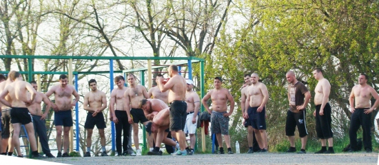 30-04-2012. Группа накачанных молодых людей более 20 чел. во главе с инструктором на спортивной площадке в Отраде отрабатывали один-единственный прием – захват и препровождение «арестованных»