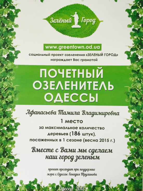Получив эту грамоту, хочется сказать прежде всего каждому Одесситу, который закупил деревья или кустарники, или просто дал по возможности денег для высадки, или вышел помочь высадить дерево, или элементарно вынес ведро воды и полил новое растение — всем спасибо!!! Отдельная благодарностьАнатолию Кавунза прекрасную инициативу, которая объединила людей не по политическим взглядам, а по социальному желанию улучшить и озеленить наш город! Многие каждый сезон проводят коллективные или дворовые субботники, но именно благодаря социальной инициативе Анатолия, в этом году это проходило с большим воодушевлением для многих жителей, ведь они ощущали единение с соседом или незнакомым пользователем в соцсети!!! Было высажено более 1300 деревьев и 500 кустарников, а в проекте приняли участие почти 600 человек, которые официально заявили о своем участии и получили грамоту, а также более 1000 людей, которые просто выходили и помогали в данной акции. Прекрасно, что мэр города Геннадий Труханов и руководство Зелентреста также поддержало эту инициативу и способствовало во многом Одесситам для высадки деревьев! И конечно, большая благодарность моему дружному коллективу и всем присоединившимся детям, взрослым, школьникам и пенсионерам! Вы все подарили нам незабываемую и чудесную весну 2015 г. в очень сложное для всех нас и Украины время!!! Также, мне приятно, что Одесситы поддержали и выполнили заявленное озеленение на общественных слушаниях в феврале в районе Ланжерона и это не последняя высадка в этом месте для жителей Одессы и гостей города!