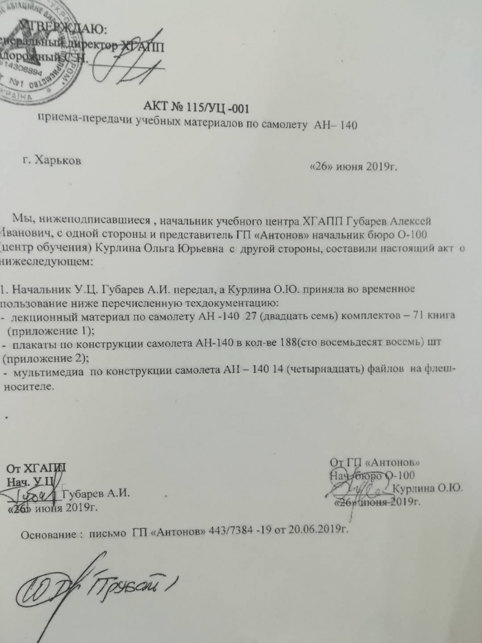 Итак, под конец 2018 года главный инженер Бычков и директор по кадровым вопросам ГП «Антонов» Маевский решили «приобрести» у Харьковского государственного авиационного производственного предприятия (ХГАПП) методические рекомендации по самолету АН-140 (то есть, купить 188 плакатов по цене 4, 6 миллиона гривен!!! ), который серийно не выпускается, и конструкторская документация на который хранится на ГП «Антонов».