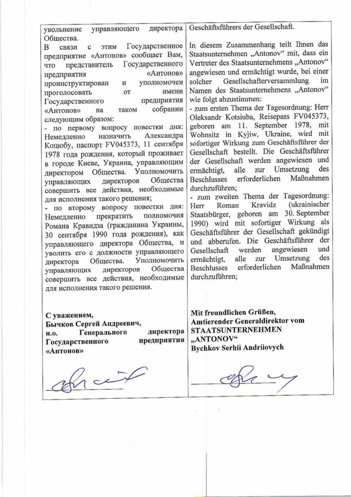 Неужели Бычков не понимал, кто эти лица и чем это чревато в случае провала всей операции по внедрению Коцюбы на должность второго директора немецкой компании Antonov Logistic Salis? Конечно, понимал и заведомо знал, что подписывает – ведь насоветовали «советники» и юристы — доверенные лица Сергея Андреевича…