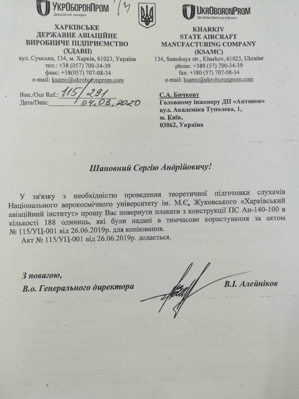 В марте 2020 года руководитель ХГАПП письменно обращается к главному инженеру Бычкову срочно вернуть плакаты по АН-140 в количестве 188 штук, которые вышеуказанным актом были переданы во временное пользование.