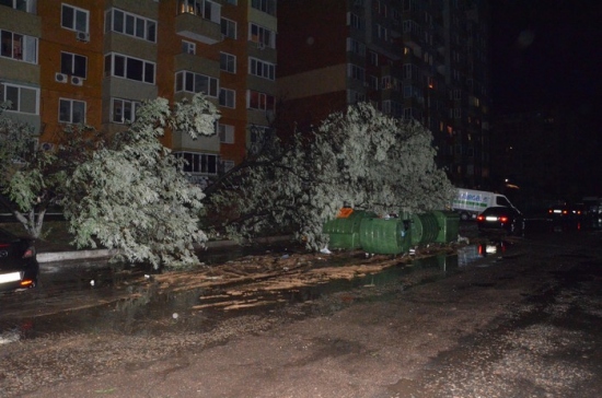Упавшее полусухое дерево на улице Сахарова полностью заблокировало единственный выезд со двора ЖК «Изумрудный город».