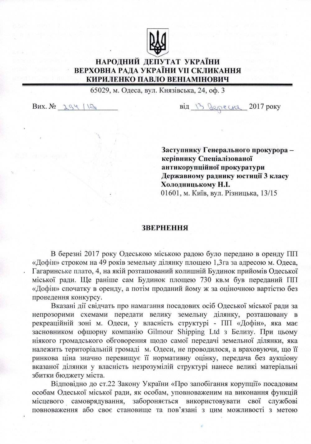 Найменша сума, яка мала б опинитися у бюджеті міста за півтора гектари землі на Гагарінському Плато, колишньої резиденції Одеської мерії, склала б один мільярд гривень. Але ці гроші, як і мільярди інших, поповнюють рахунки в офшорах одеського міського голови та його партнерів і аж ніяк не бюджет Одеси.