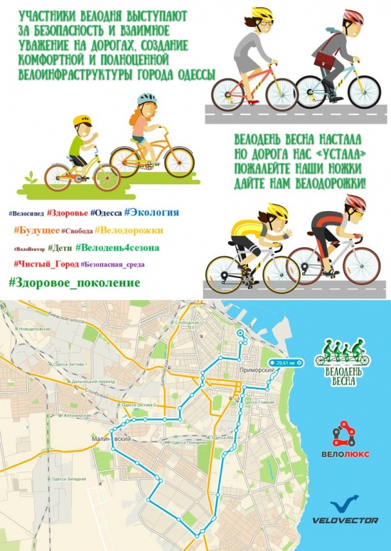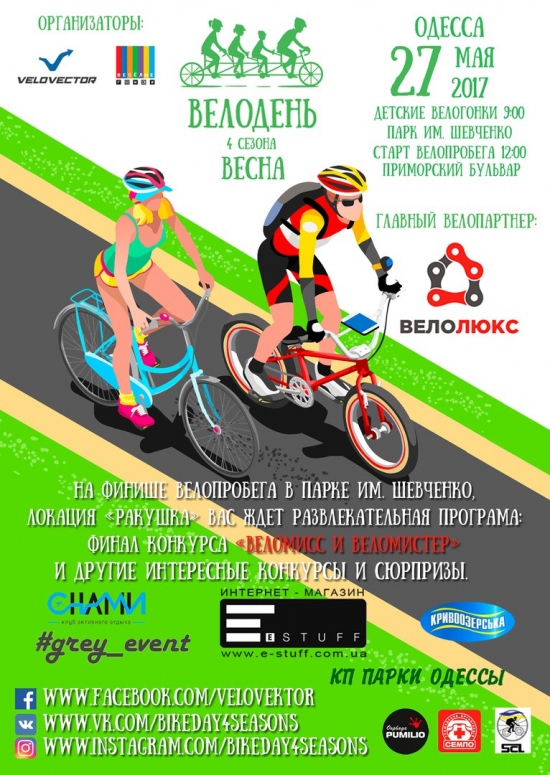 27 мая 2017г. в Одессе в рамках проекта «Велодень 4 сезона» и Всеукраинского Велодня состоится Велодень Весна ! Велосипедный праздник для всей семьи, в котором может бесплатно принять участие каждый желающий. Приглашаем всех любителей двуколесного транспорта, не зависимо от стажа вождения и типа велосипеда. В программе Велодня: с 9:00 до 14:00 — «Детские велогонки» в разных категориях от Веселые Гонки в Парке Шевченко Состязание на беговелах, самокатах и трёхколёсных велосипедах для малышей. Награждение, призы и медали для всех участников. Кольцевая гонка вокруг стадиона «Черноморец» для тех кто постарше. с 11:00 до 13:30 — Масштабный велопробег «Велодень Весна» по улицам г. Одессы Многотысячная колонна велосипедистов проедет по улицам родного города, и покажет что Одесса – велосипедный город! Комфорт и безопасность обеспечивает команда опытных Маршалов ВелоВектор в сопровождении полиции и медиков. с 13:30 до 16:00 — Развлекательная программа от организаторов с конкурсами и призами. Конкурс «ВелоМисс и ВелоМистер». На финише велопробега участников ждет насыщенная интересная развлекательная программа с конкурсами и призами, проводится опытным ведущим и девушками-маршалами «Велодень 4 сезона». Подведение итогов конкурса «ВелоМисс и ВелоМистер». Тёплая дружеская велосипедная атмосфера гарантирована. На территории проведения Велодня будут работать фудкорты с едой и напитками, а также музыкальное сопровождение со сцены (Ракушка). Организаторы: ВелоВектор ФБ: https://www.facebook.com/events/657256804468616 |