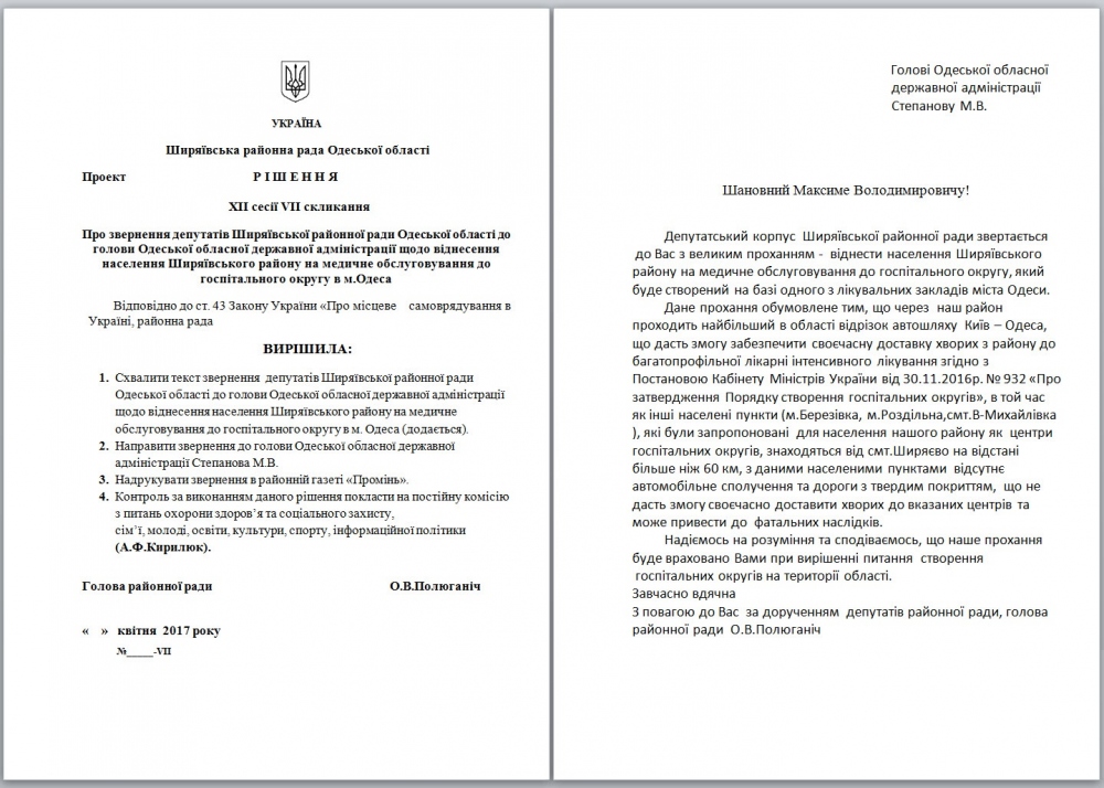 Завтра, 21 апреля 2017 года, депутаты Ширяевского районного совета на сессии инициируют рассмотрение обращения к губернатору области Максиму Степанову с требованием отнести население Ширяевского района по медицинскому обслуживанию к госпитальному округу в городе Одессе. Инициаторами такого обращения выступили сами депутаты райсовета, не зависимо от фракционной принадлежности. Вероятность принятия такого обращения очень велика. И если такое произойдет, то это будет своего рода прецедент. Потому что ранее отдельные районы, возмущенные непрозрачностью процессом формирования госпитальных округов, выразили через решения сессии свое недовольство предложенными облгосадминистрацией 11 вариантами госпитальных округов. Не согласными с вариантом областных чиновников остаются Болград, Килия, Сарата, Татарбунары и Раздельная. В Ширяево же пошли дальше. Они хотят, чтобы жители района лечились в Одессе, и бюджетное законодательство, в частности, это позволяет. Депутаты Ширяевского районного совета мотивируют свою инициативу тем, что от Ширяево до предлагаемых госпитальных центров в Березовке и Великомихайловке расстояние более 60 километров, а автомобильное сообщение с нормальными дорогами между данными райцентрами отсутствует. |