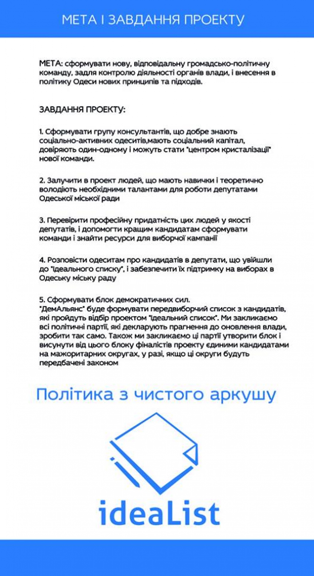 В суботу, 6 червня, о 12:00 на Приморському бульварі в районі Думської площі, пройде публічна презентація проекту «Ідеальний список».