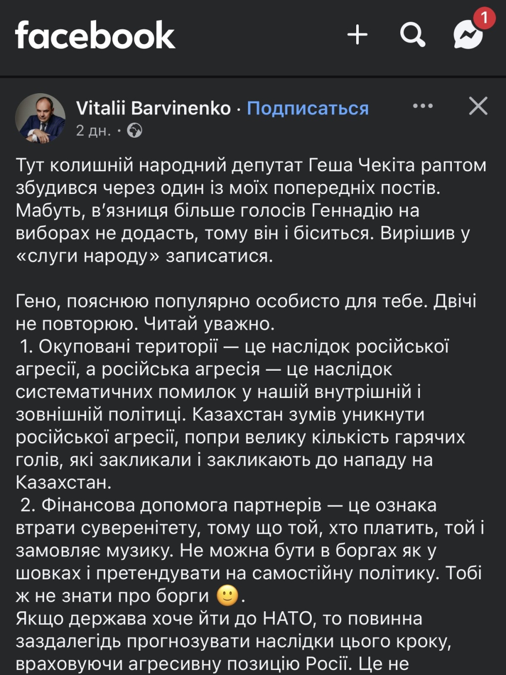Сьогодні випадково натрапив на публікацію VitaliiBarvinenko у Facebook, у якій автор зазначає:«Окуповані території — це наслідок російської агресії, а російська агресія — це наслідок систематичних помилок у нашій внутрішній і зовнішній політиці…»