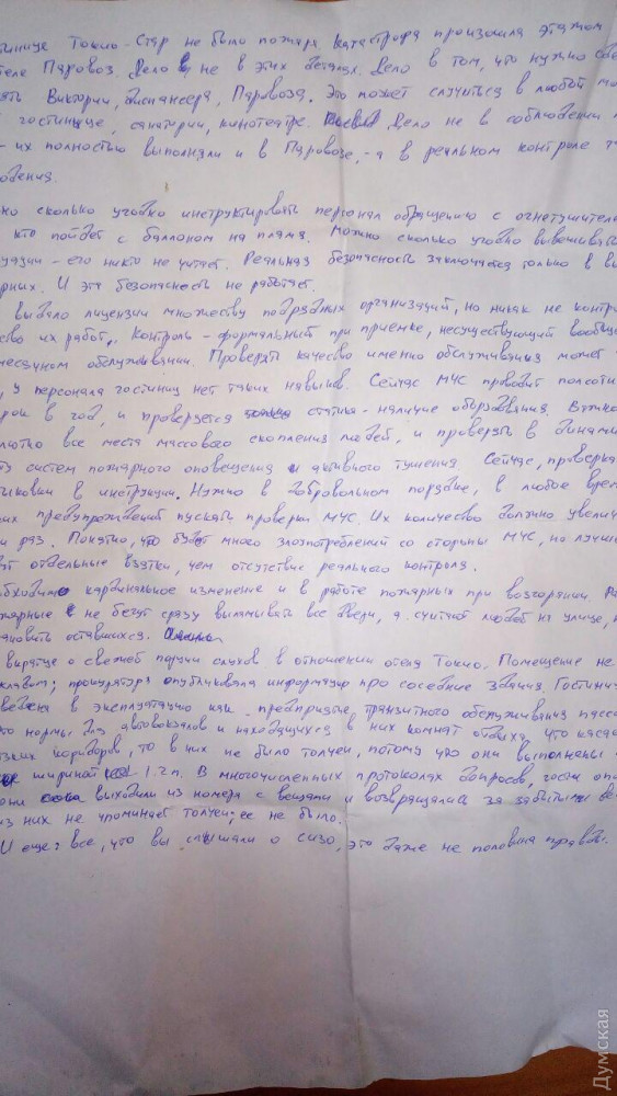 И вкратце о свежей порции слухов в отношении отеля «Токио». Помещение не является складом; прокуратура опубликовала информацию про соседние здания. Гостиница правильно введена в эксплуатацию как предприятие транзитного обслуживания пассажиров. Это нормы для автовокзалов и находящихся в них комнат отдыха. Что касается якобы узких коридоров, то в них не было толчеи, потому что они выполнены по нормам ДБН, шириной 1,2 метра. В многочисленных протоколах допросов гости описывают, как они выходили из номера с вещами и возвращались за забытыми вещами — никто из них не упоминает толчеи; ее не было.