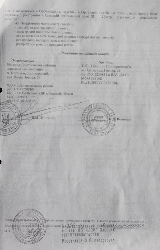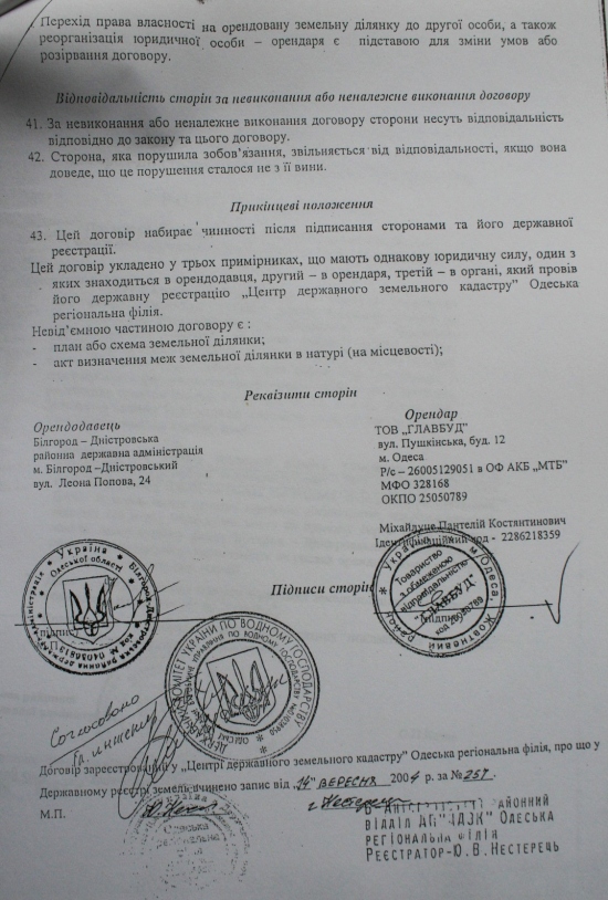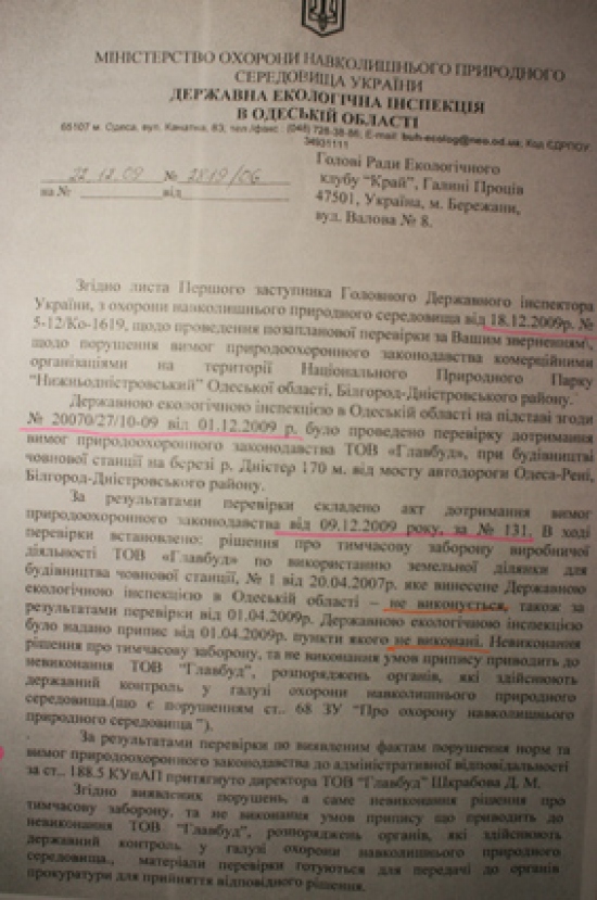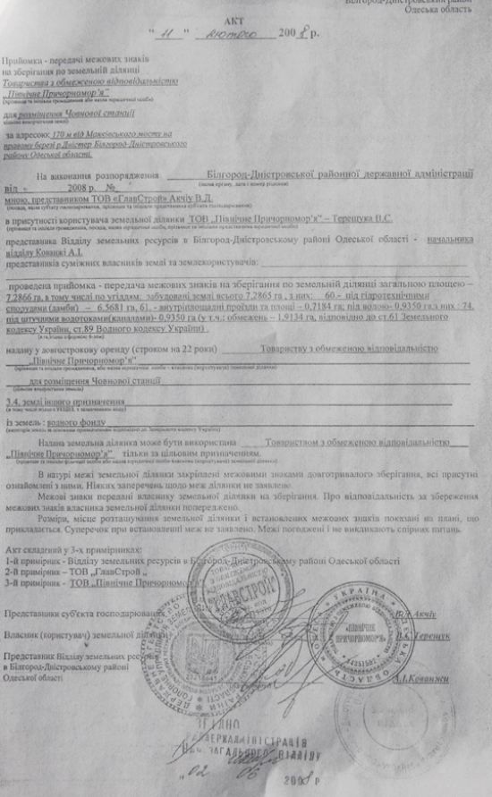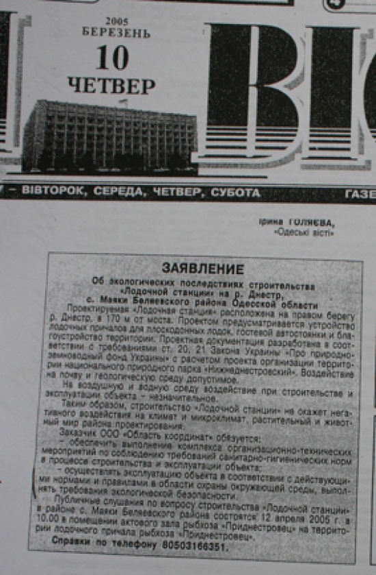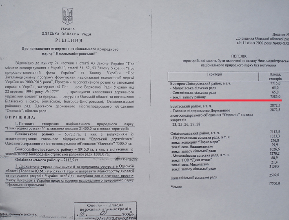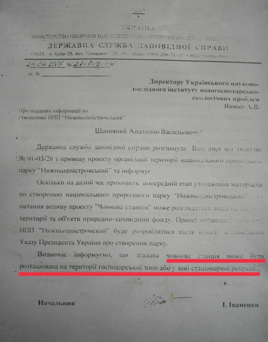 11 января 2002 года Одесский областной совет принял решение №400-ХХ1 по согласованию площадей и границ Нижнеднестровского национального природного парка (см.фотокопию). Между тем, чиновники Б-Днестровского района, а также все областные чиновничьи службы, проигнорировали этот документ и согласовывают противозаконный, как для национального парка объект, так и тот, который противоречит ст.89 Водного кодекса Украины – будущий мегаполис. К тому же, коррумпированные чиновники минэкологии (управление экологии в Одесской области и Департамент заповедного дела Минэкологии) в своих заключениях заведомо искажают ценность природного участка и фактически сдают прибрежную зону на растерзание коттеджным магнатам. И первую скрипку тогда сыграл начальник департамента заповедного дела Минэкологии Иваненко И.Б. Что парадоксально, что он лично со своей семьей и детьми, выезжал на Днестр. Члены ежегодной экспедиции «Днестр», которую я возглавлял на протяжении 20 лет, показывали ему эти ценные и уникальные территории, и что они должны быть сохранены, как ценнейшие природные экосистемы. И вдруг, Иваненко И.Б. дает «зеленую дорогу», так называемой, лодочной станции – дает заключение о том, что она может быть размещена в хозяйственной зоне или зоне стационарной рекреации национального парка (?) (см. фотокопию его письма и подписи). При этом, как «долгоиграющий» чиновник, он прекрасно понимал, какие зоны в парках и где они могут быть. Но это не все. Занимая такой пост, впоследствии, правда, «донецкие» его перевели на должность зама департамента, он все время блокировал обращения экологов к президентам, генпрокурорам, министрам по поводу полного уничтожения уникального заповедного луга, так называемой лодочной станцией, а фактически мегаполиса на Днестре. Именно он, в свое время, вместе со своим директором департамента заповедного дела Концураком В.В. «прикрывал» 3-х директоров Нижнеднестровского национального природного парка от ответственности за нарушения, творящиеся на территории самого национального парка. А теперь, после революции достоинства, его начальник «заслужил» себе должность в Кабмине, а этот чиновник снова (! ) поднимается по служебной лестнице и занимает пост начальника департамента заповедного дела. И как вы думаете, что он позитивного может сделать для спасения заповедных земель Днестра? Между тем, пока коррупционеры Одесского управления экологии, а тем более киевские чиновники переходят из одного министерского кресла в другое, компании-коттеджники, прочувствовав безнаказанность за захват и уничтожение ценных природоохранных земель, стали расширять заповедник коррупции. Вначале завуалированный арсенал компаний, который начинался с заказчика «Область координат», подает Заявление об экологических последствиях (см. фотокопию), и намеревается благоустроить территорию (модный тренд последнего времени по благоустройству: заявляют благоустройство, а фактически уничтожают природную основу благоустройства, как сейчас происходит на Ланжероне в Одессе, например, а на самом деле нещадно застраивают территорию). Область координат разрастается впоследствии Главстроем-Главбудом-Головбудом — юридическими лицами с похожими названиями, созданными для обмана не только общественности, но и всей правоохранительной системы, чтобы уйт