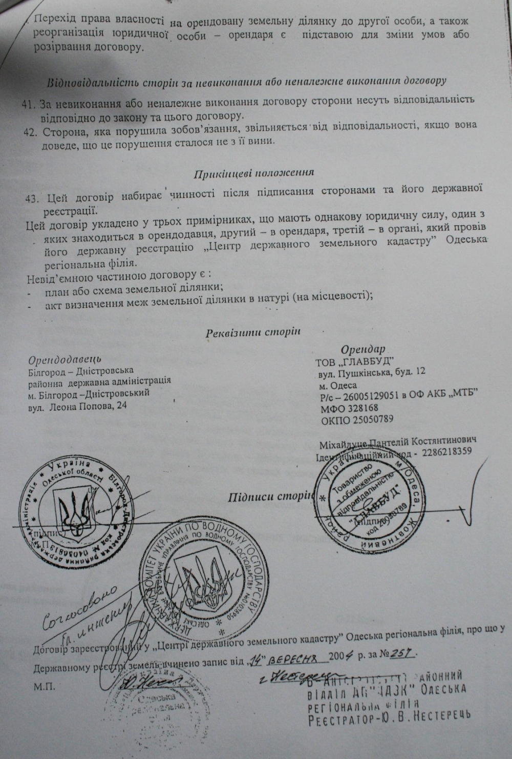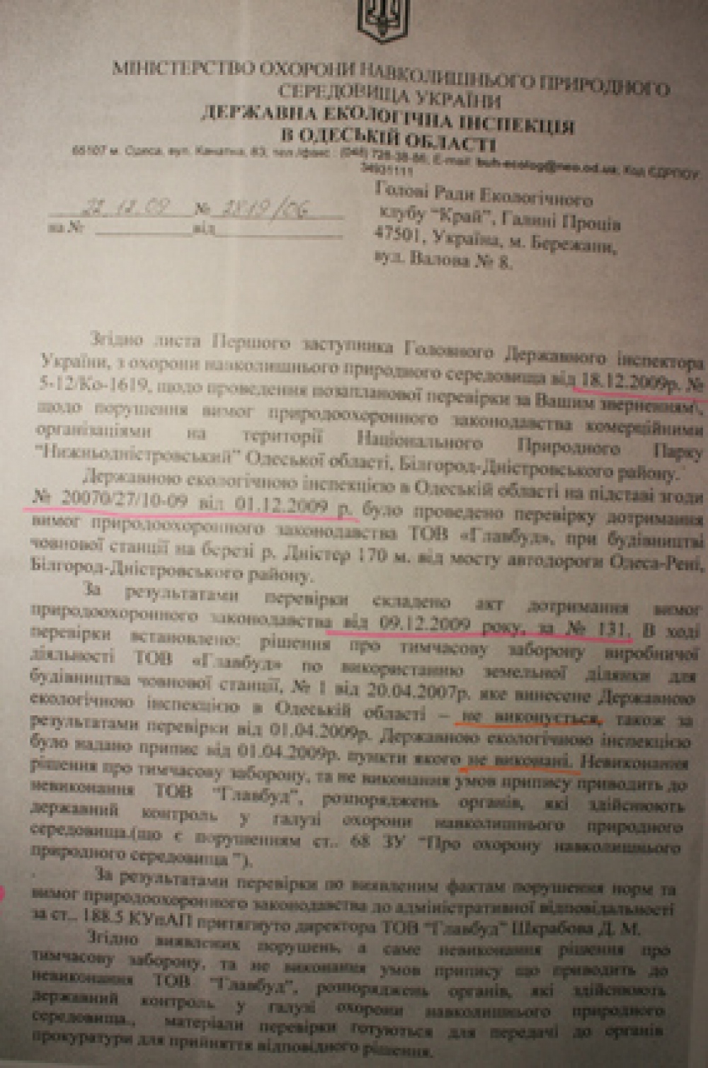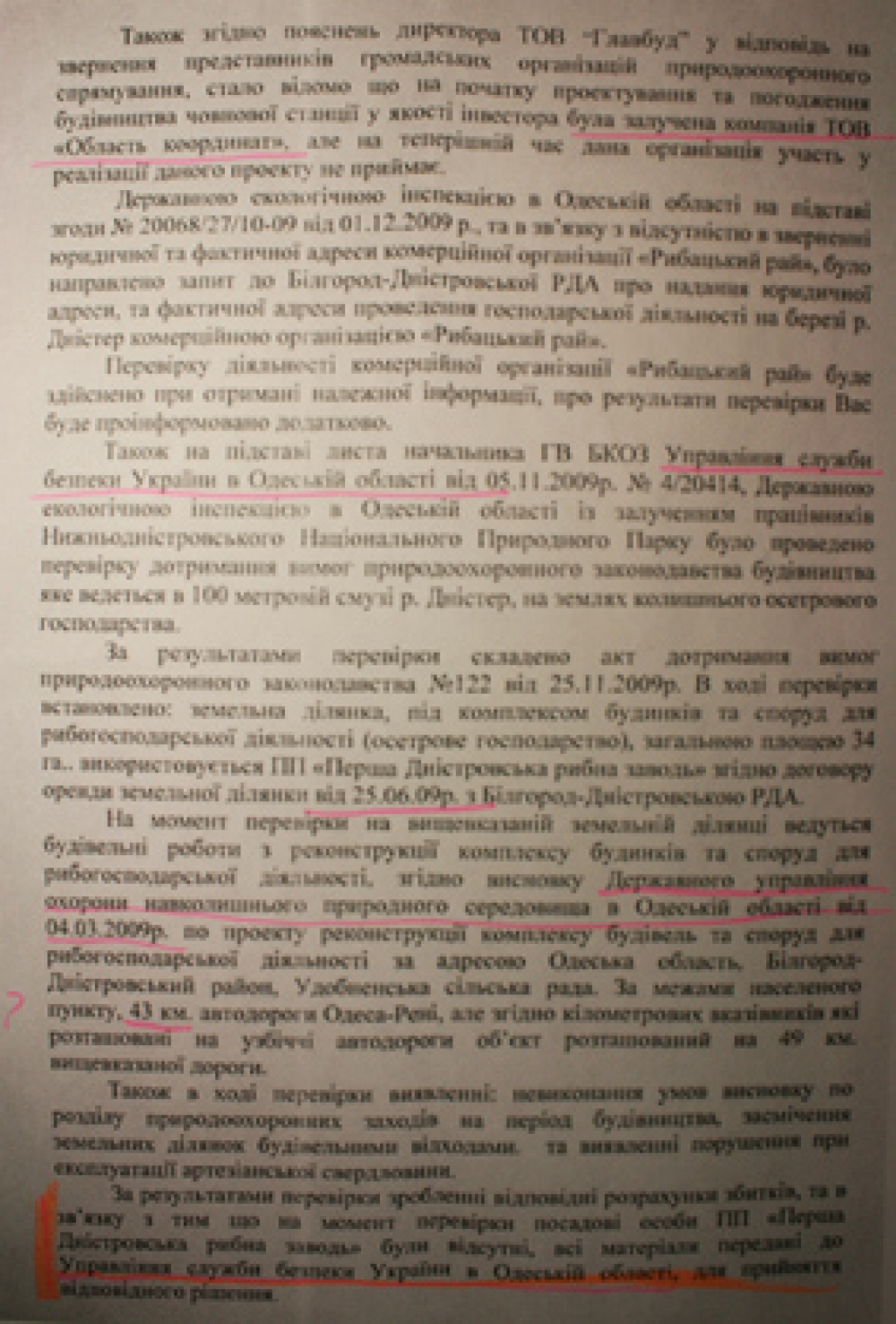 11 января 2002 года Одесский областной совет принял решение №400-ХХ1 по согласованию площадей и границ Нижнеднестровского национального природного парка (см.фотокопию). Между тем, чиновники Б-Днестровского района, а также все областные чиновничьи службы, проигнорировали этот документ и согласовывают противозаконный, как для национального парка объект, так и тот, который противоречит ст.89 Водного кодекса Украины – будущий мегаполис. К тому же, коррумпированные чиновники минэкологии (управление экологии в Одесской области и Департамент заповедного дела Минэкологии) в своих заключениях заведомо искажают ценность природного участка и фактически сдают прибрежную зону на растерзание коттеджным магнатам. И первую скрипку тогда сыграл начальник департамента заповедного дела Минэкологии Иваненко И.Б. Что парадоксально, что он лично со своей семьей и детьми, выезжал на Днестр. Члены ежегодной экспедиции «Днестр», которую я возглавлял на протяжении 20 лет, показывали ему эти ценные и уникальные территории, и что они должны быть сохранены, как ценнейшие природные экосистемы. И вдруг, Иваненко И.Б. дает «зеленую дорогу», так называемой, лодочной станции – дает заключение о том, что она может быть размещена в хозяйственной зоне или зоне стационарной рекреации национального парка (?) (см. фотокопию его письма и подписи). При этом, как «долгоиграющий» чиновник, он прекрасно понимал, какие зоны в парках и где они могут быть. Но это не все. Занимая такой пост, впоследствии, правда, «донецкие» его перевели на должность зама департамента, он все время блокировал обращения экологов к президентам, генпрокурорам, министрам по поводу полного уничтожения уникального заповедного луга, так называемой лодочной станцией, а фактически мегаполиса на Днестре. Именно он, в свое время, вместе со своим директором департамента заповедного дела Концураком В.В. «прикрывал» 3-х директоров Нижнеднестровского национального природного парка от ответственности за нарушения, творящиеся на территории самого национального парка. А теперь, после революции достоинства, его начальник «заслужил» себе должность в Кабмине, а этот чиновник снова (! ) поднимается по служебной лестнице и занимает пост начальника департамента заповедного дела. И как вы думаете, что он позитивного может сделать для спасения заповедных земель Днестра? Между тем, пока коррупционеры Одесского управления экологии, а тем более киевские чиновники переходят из одного министерского кресла в другое, компании-коттеджники, прочувствовав безнаказанность за захват и уничтожение ценных природоохранных земель, стали расширять заповедник коррупции. Вначале завуалированный арсенал компаний, который начинался с заказчика «Область координат», подает Заявление об экологических последствиях (см. фотокопию), и намеревается благоустроить территорию (модный тренд последнего времени по благоустройству: заявляют благоустройство, а фактически уничтожают природную основу благоустройства, как сейчас происходит на Ланжероне в Одессе, например, а на самом деле нещадно застраивают территорию). Область координат разрастается впоследствии Главстроем-Главбудом-Головбудом — юридическими лицами с похожими названиями, созданными для обмана не только общественности, но и всей правоохранительной системы, чтобы уйт