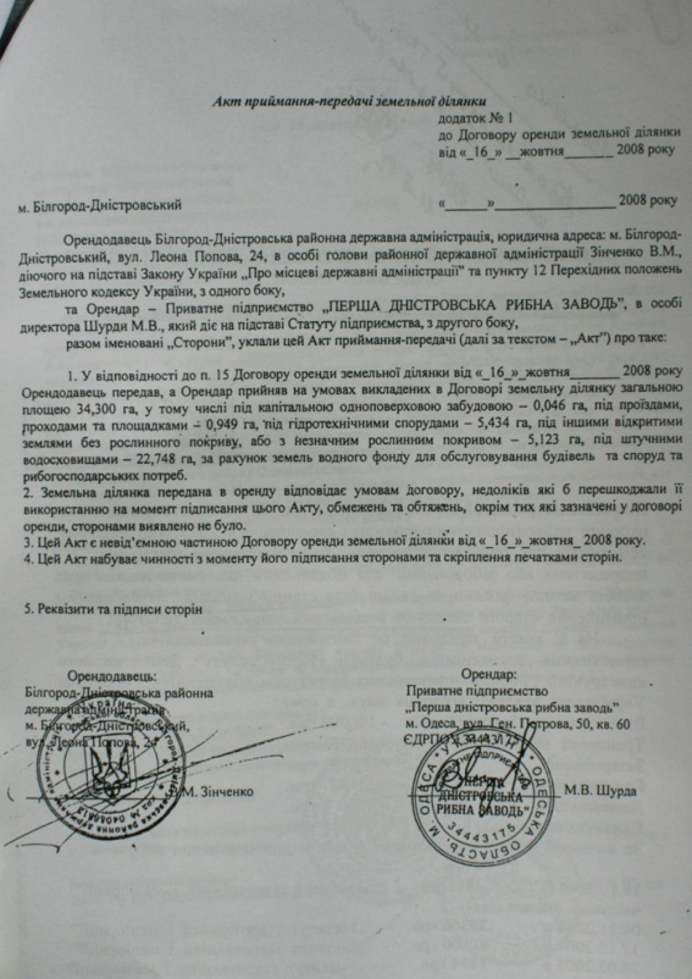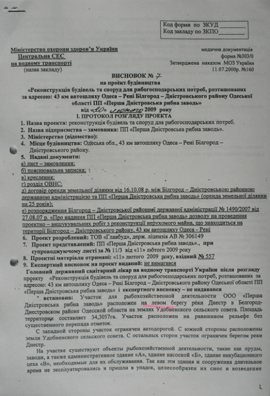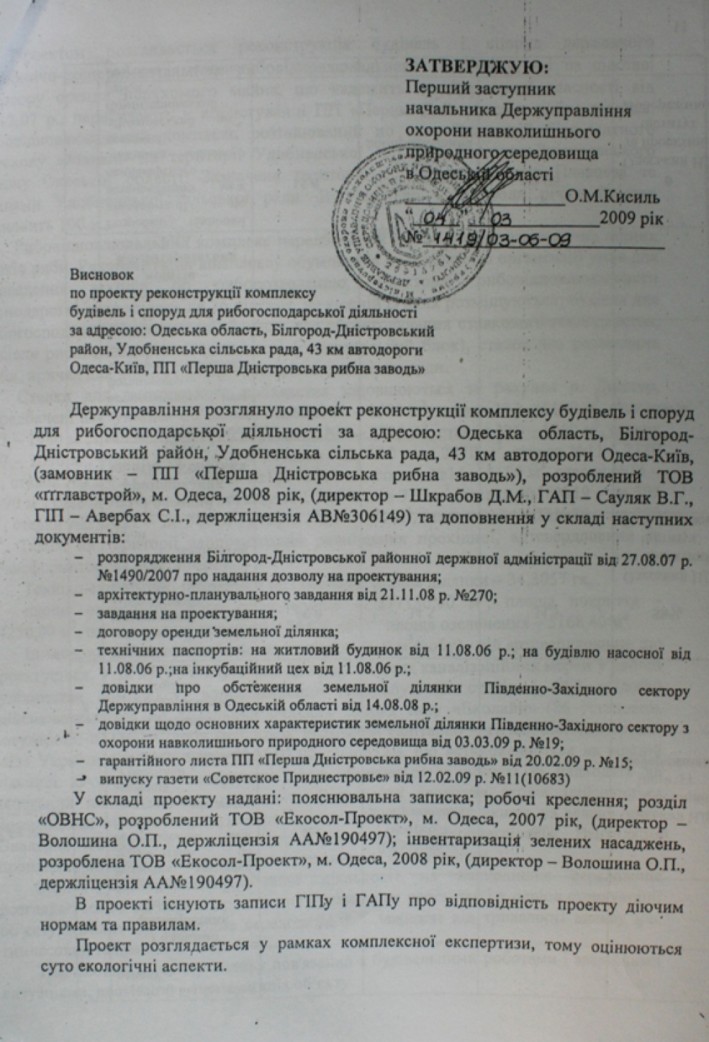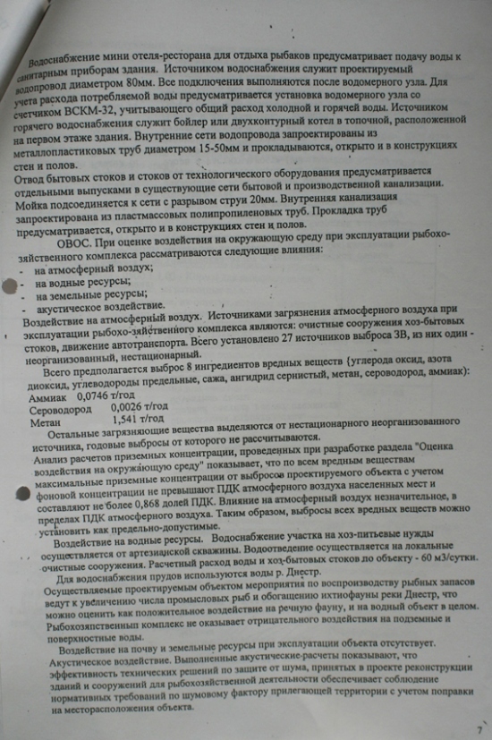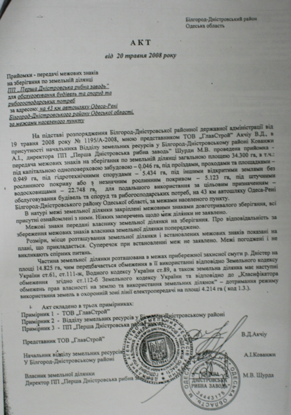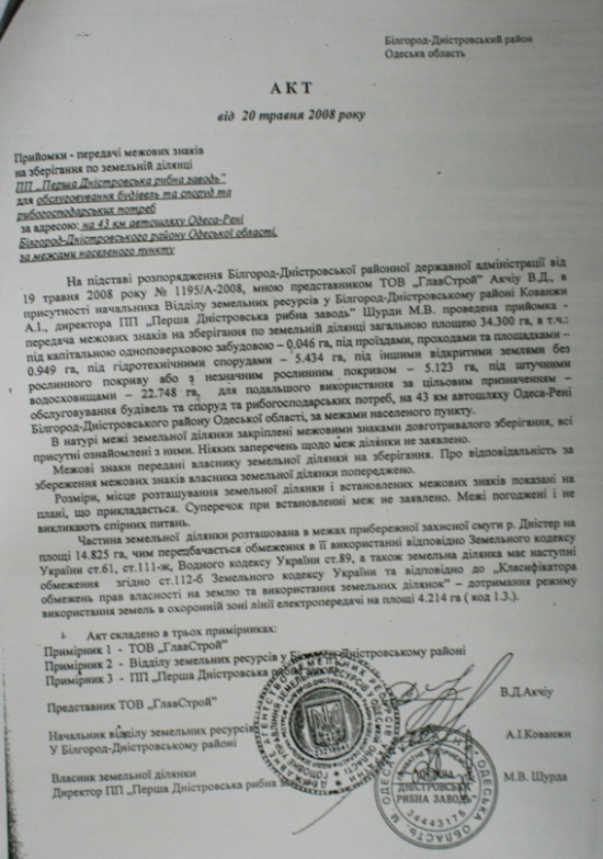 Наглое вмешательство в хрупкую экосистему бывшего осетрового хозяйства, ставшего впоследствии заповедным урочищем «Днестровские плавни», началось и,   фактически стало узаканиваться, высокопоставленными чиновниками в Одесской области. Это происходило при попустительстве руководства государственного учреждения «Одессарыбвод», на балансе которого находилась остаточная собственность имущества бывшего осетрового хозяйства. Экочиновник дал старт разрушению заповедных земель в результате экологической экспертизы проекта, который разработал уже известный вам по 3-6 частям ЗАПОВЕДНИКА КОРРУПЦИИ ООО «Главстрой», — «создатель» первых двух мегаполисов на заповедных землях Днестра (см. фотокопию экспертизы). А инспекция ГАСК в Одесской области 30.06.2009 г. выдала разрешение № 609 на «….реконструкцию комплекса строений и сооружений…» якобы …для рыбохозяйственной деятельности… (см. фотокопию). Кому? Частному предприятию «Первая днестровская рыбная заводь». Причем, Договор аренды земли всей площади бывшего осетрового хозяйства был составлен всего лишь на 5 дней раньше — 25.06.2009 г. (см.фотокопию). Между тем сам Акт приема – передачи земельного участка выдан на год раньше – в 2008 г., но без конкретной даты (см. фотокопию). Но, обратите внимание, что в «шапке» Акта написано, что он является дополнением к Договору не от 25.06.2009 г. (см.выше), а от 16.10.2008 г.(! ). Но и это не все. Если посмотреть на Акт приема-передачи межевых знаков, то там дата стоит 20.05.2008 г. (см.фотокопию). Причем, здесь, как и на двух первых мегаполисах, снова почему-то фигурирует ООО «Главстрой». То есть афера на заповедных землях и подлог в документах, очевидны, тем более что на самом деле строятся коттеджи, рестораны, гостиницы и т.д. (см. фотокопию – Заключение СЭС на водном транспорте), а не реконструкция строений для рыбохозяйственных целей – ЗАПОВЕДНИК КОРРУПЦИИ в действии.
