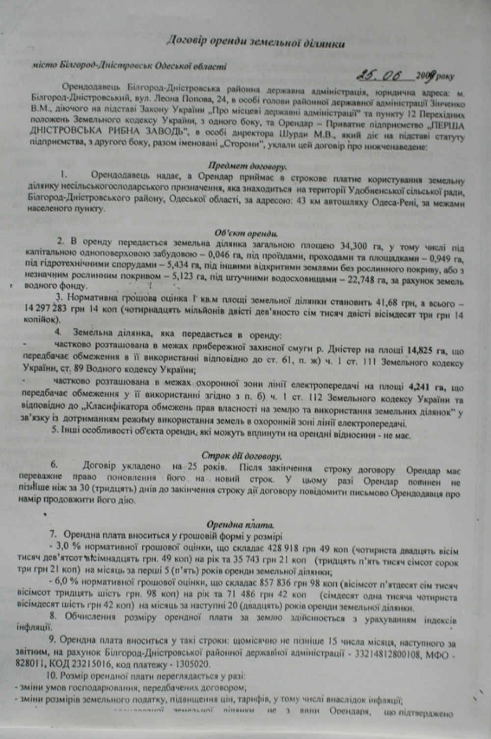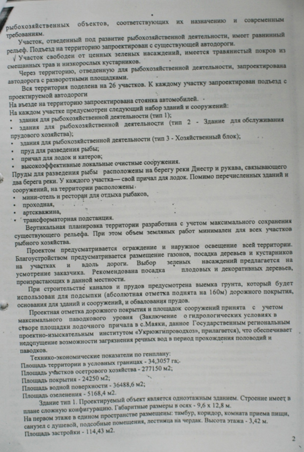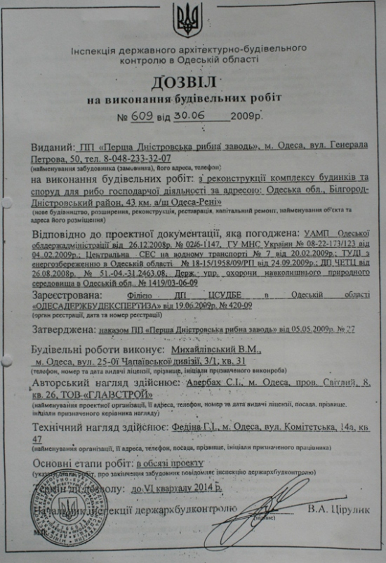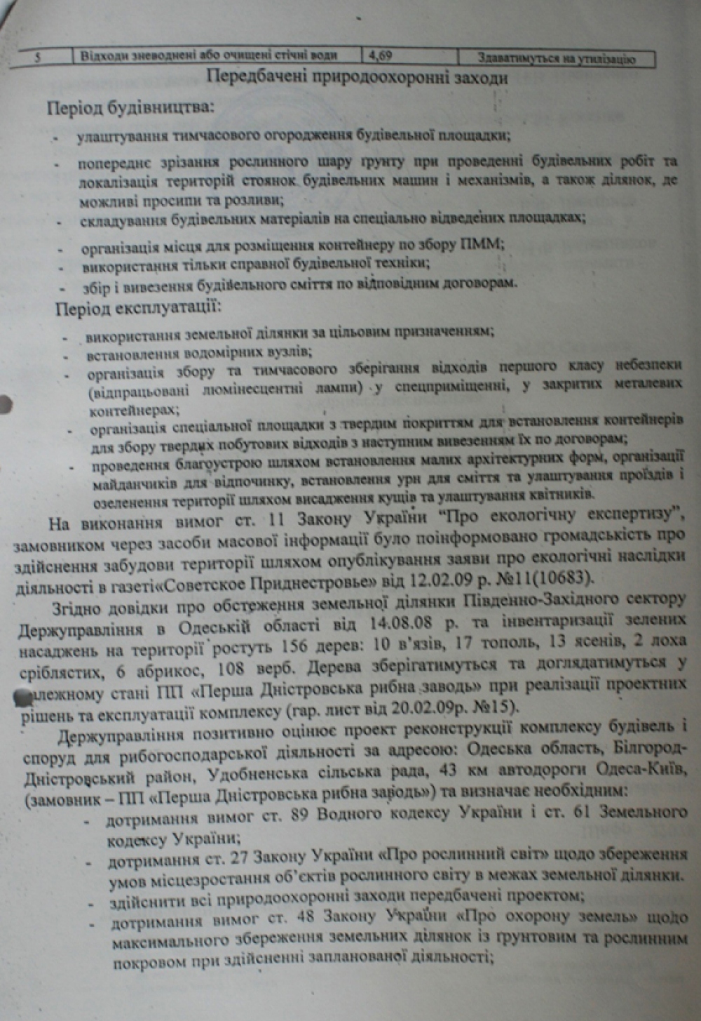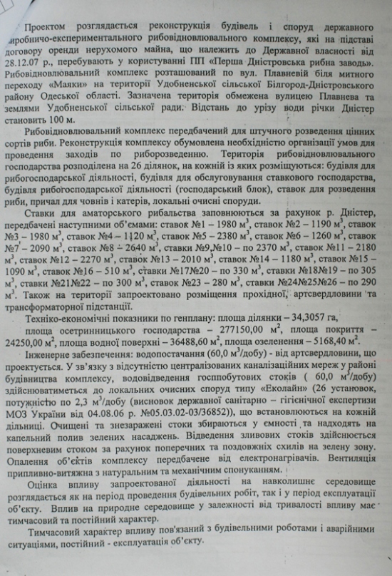 Наглое вмешательство в хрупкую экосистему бывшего осетрового хозяйства, ставшего впоследствии заповедным урочищем «Днестровские плавни», началось и,   фактически стало узаканиваться, высокопоставленными чиновниками в Одесской области. Это происходило при попустительстве руководства государственного учреждения «Одессарыбвод», на балансе которого находилась остаточная собственность имущества бывшего осетрового хозяйства. Экочиновник дал старт разрушению заповедных земель в результате экологической экспертизы проекта, который разработал уже известный вам по 3-6 частям ЗАПОВЕДНИКА КОРРУПЦИИ ООО «Главстрой», — «создатель» первых двух мегаполисов на заповедных землях Днестра (см. фотокопию экспертизы). А инспекция ГАСК в Одесской области 30.06.2009 г. выдала разрешение № 609 на «….реконструкцию комплекса строений и сооружений…» якобы …для рыбохозяйственной деятельности… (см. фотокопию). Кому? Частному предприятию «Первая днестровская рыбная заводь». Причем, Договор аренды земли всей площади бывшего осетрового хозяйства был составлен всего лишь на 5 дней раньше — 25.06.2009 г. (см.фотокопию). Между тем сам Акт приема – передачи земельного участка выдан на год раньше – в 2008 г., но без конкретной даты (см. фотокопию). Но, обратите внимание, что в «шапке» Акта написано, что он является дополнением к Договору не от 25.06.2009 г. (см.выше), а от 16.10.2008 г.(! ). Но и это не все. Если посмотреть на Акт приема-передачи межевых знаков, то там дата стоит 20.05.2008 г. (см.фотокопию). Причем, здесь, как и на двух первых мегаполисах, снова почему-то фигурирует ООО «Главстрой». То есть афера на заповедных землях и подлог в документах, очевидны, тем более что на самом деле строятся коттеджи, рестораны, гостиницы и т.д. (см. фотокопию – Заключение СЭС на водном транспорте), а не реконструкция строений для рыбохозяйственных целей – ЗАПОВЕДНИК КОРРУПЦИИ в действии.