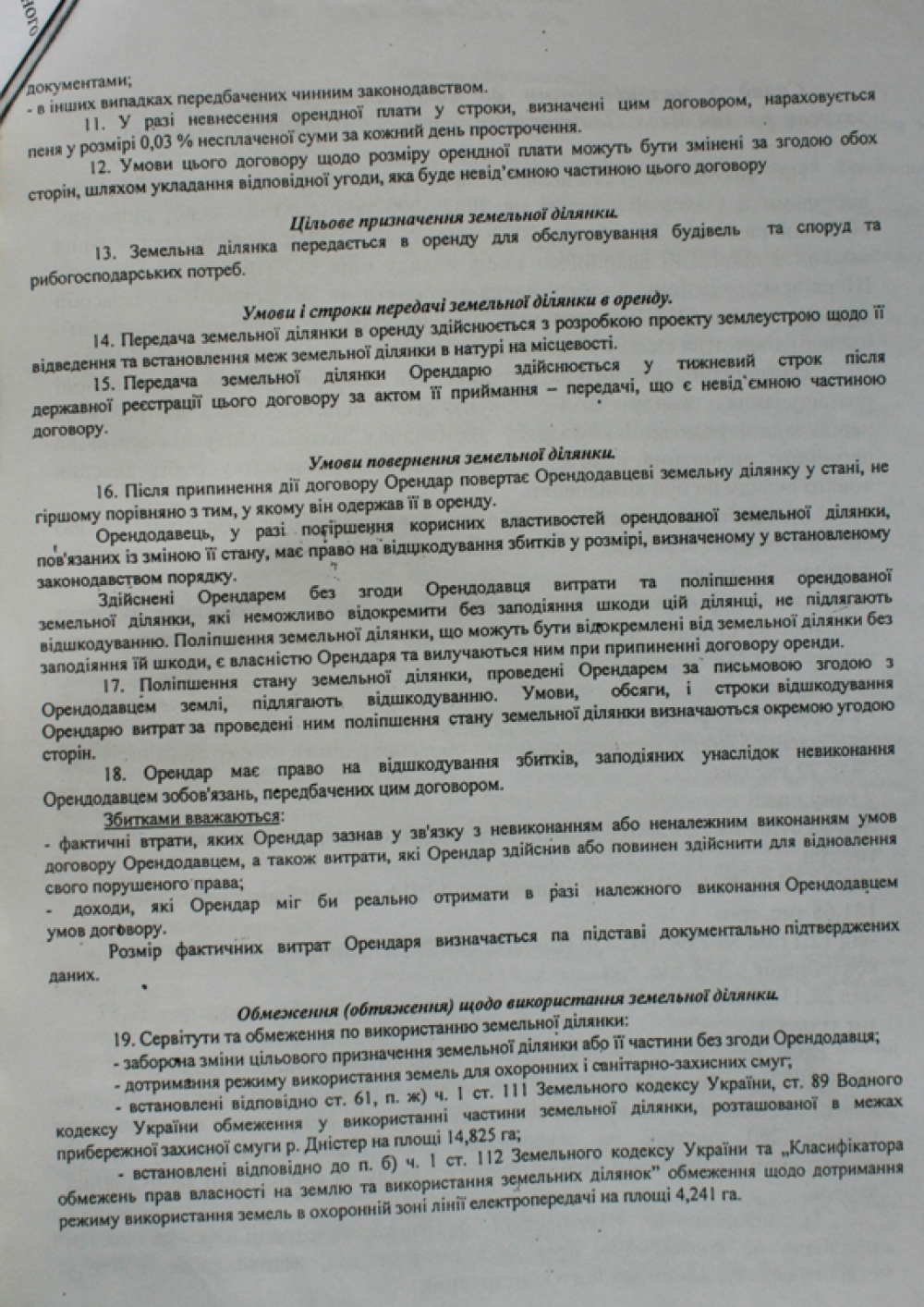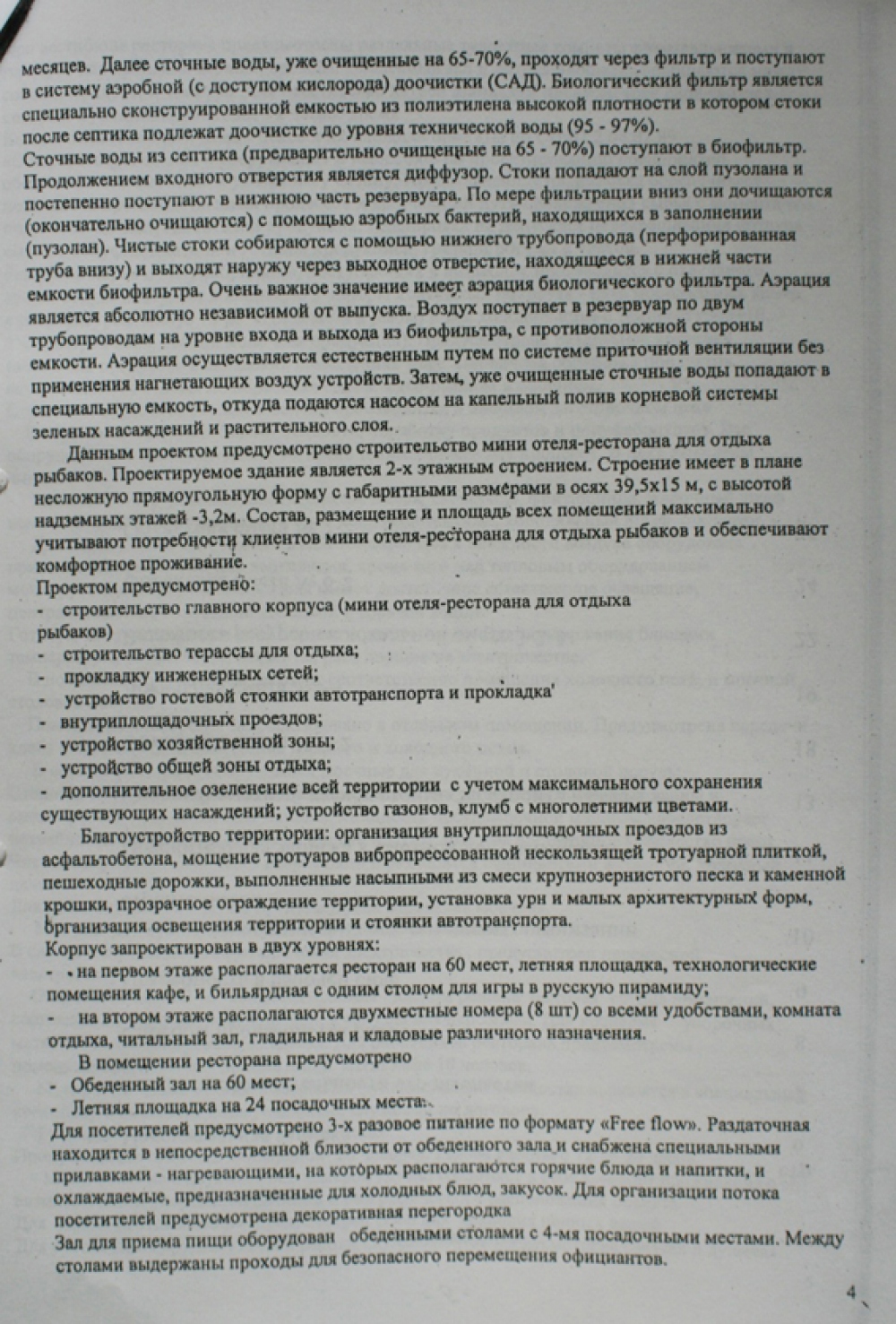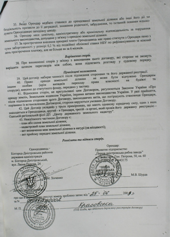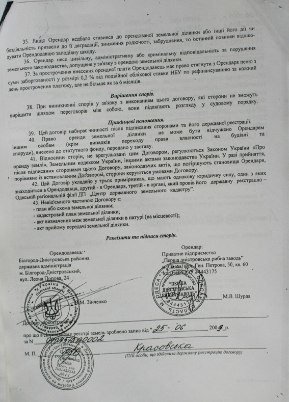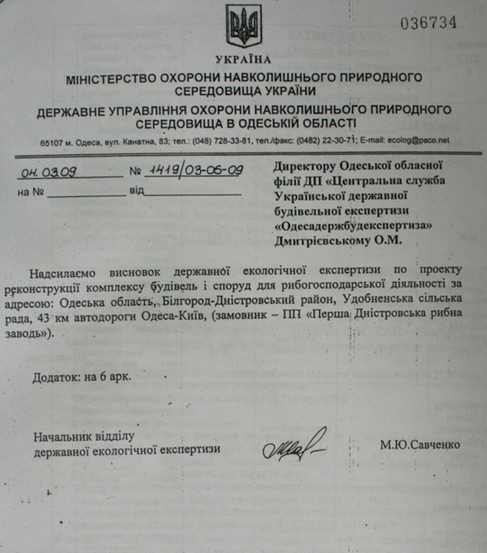 Наглое вмешательство в хрупкую экосистему бывшего осетрового хозяйства, ставшего впоследствии заповедным урочищем «Днестровские плавни», началось и,   фактически стало узаканиваться, высокопоставленными чиновниками в Одесской области. Это происходило при попустительстве руководства государственного учреждения «Одессарыбвод», на балансе которого находилась остаточная собственность имущества бывшего осетрового хозяйства. Экочиновник дал старт разрушению заповедных земель в результате экологической экспертизы проекта, который разработал уже известный вам по 3-6 частям ЗАПОВЕДНИКА КОРРУПЦИИ ООО «Главстрой», — «создатель» первых двух мегаполисов на заповедных землях Днестра (см. фотокопию экспертизы). А инспекция ГАСК в Одесской области 30.06.2009 г. выдала разрешение № 609 на «….реконструкцию комплекса строений и сооружений…» якобы …для рыбохозяйственной деятельности… (см. фотокопию). Кому? Частному предприятию «Первая днестровская рыбная заводь». Причем, Договор аренды земли всей площади бывшего осетрового хозяйства был составлен всего лишь на 5 дней раньше — 25.06.2009 г. (см.фотокопию). Между тем сам Акт приема – передачи земельного участка выдан на год раньше – в 2008 г., но без конкретной даты (см. фотокопию). Но, обратите внимание, что в «шапке» Акта написано, что он является дополнением к Договору не от 25.06.2009 г. (см.выше), а от 16.10.2008 г.(! ). Но и это не все. Если посмотреть на Акт приема-передачи межевых знаков, то там дата стоит 20.05.2008 г. (см.фотокопию). Причем, здесь, как и на двух первых мегаполисах, снова почему-то фигурирует ООО «Главстрой». То есть афера на заповедных землях и подлог в документах, очевидны, тем более что на самом деле строятся коттеджи, рестораны, гостиницы и т.д. (см. фотокопию – Заключение СЭС на водном транспорте), а не реконструкция строений для рыбохозяйственных целей – ЗАПОВЕДНИК КОРРУПЦИИ в действии.