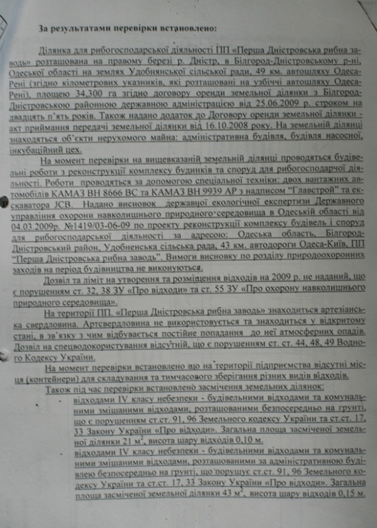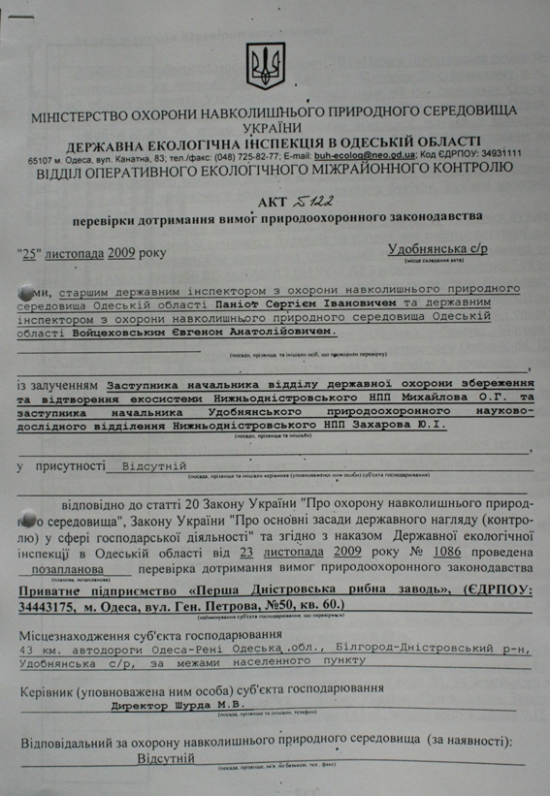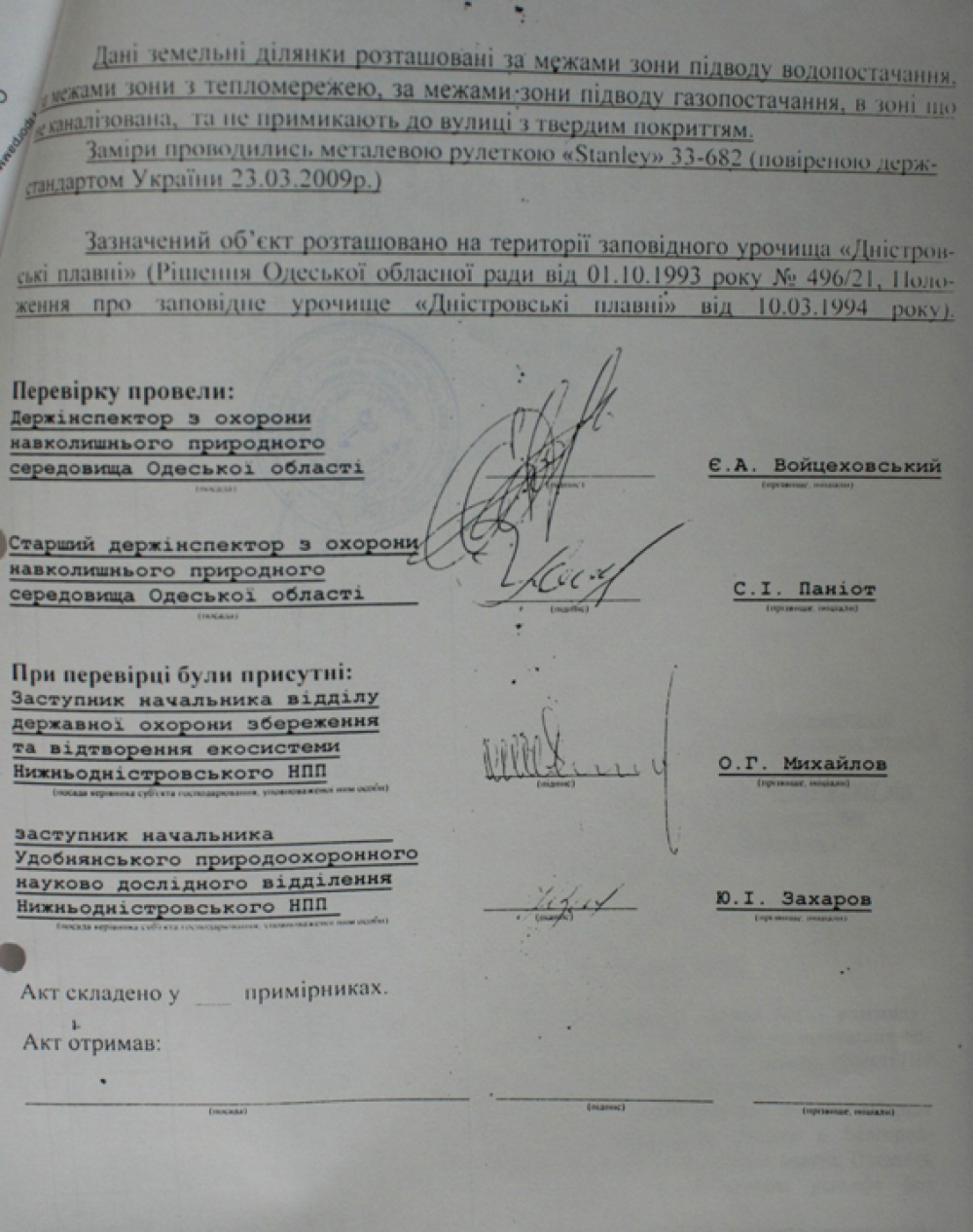 Наши обращения в различные инстанции, все-таки вынудили одну из них выехать и составить соответствующий АКТ. Так, 25 ноября 2009 г., государственная экологическая инспекция в Одесской области провела проверку этого объекта и констатировала, что он действительно расположен на территории заповедного урочища «Днестровские плавни». Причем, в комиссии приняли участие зам.начальника государственной службы охраны Нижнеднестровского национального природного парка и зам.начальника природоохранного отделения этого парка (см. фотокопию). Но, почему-то после проверки, эти документы не пошли дальше в расследование, а осели в кабинетах ЗАПОВЕДНИКА КОРРУПЦИИ, и после этого, в ход пошла тяжелая артиллерия бульдозеров, тракторов, экскаваторов для  нещадной застройки заповедных земель.