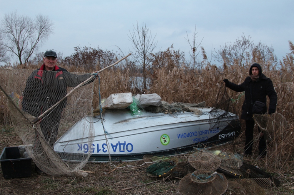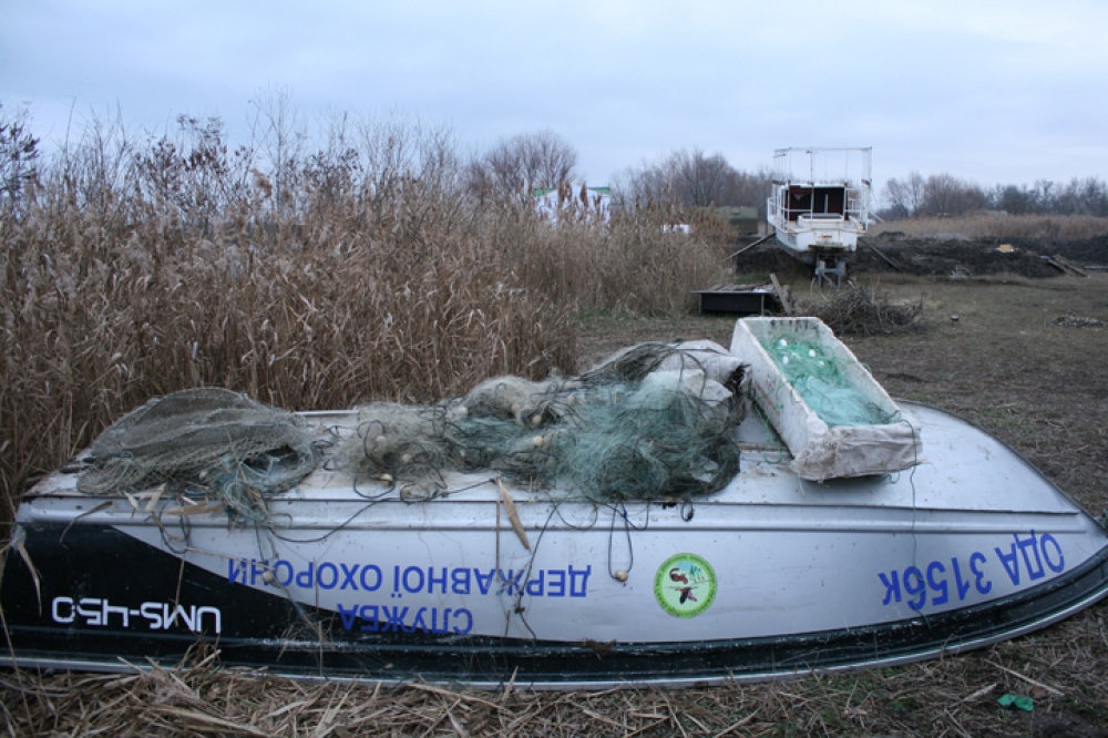 В береговой части участка находится катер службы государственной охраны Нижнеднестровского национального природного парка с госномером ОДА 3156 к. А рядом огромное количество браконьерских сеток, вентерей, рачниц. Нашли даже две рогатки для уничтожения лягушек, в которых, по свидетельству А.Жукова, стреляют и используют в качестве приманки для рачниц. Кстати, два года назад, мы с А.Жуковым и И.Щеголевым уже писали о задействовании одной из лодок Нижнеднестровского НПП, но с госномером ОДА 3157к для охраны… браконьерских сетей в заповедной зоне (!  ) самого национального парка. Статьи и фото здесь: