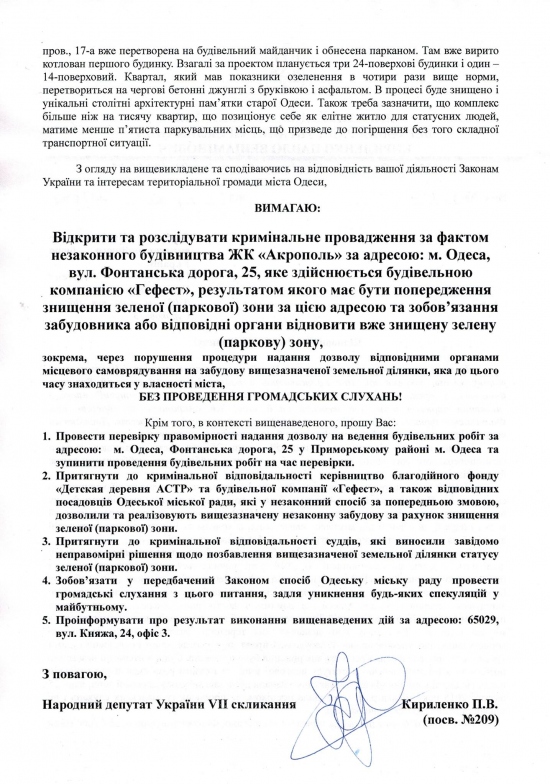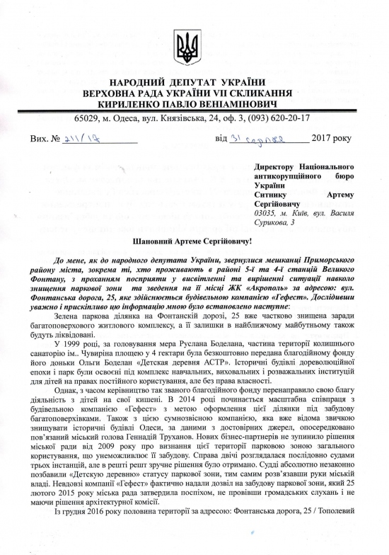 Вже близько місяця в Одесі не вщухає обурення громадськості цинічною змовою Одеської міської влади, судової системи та будівельної компанії «Гефест», яка привела до знищення унікальної паркової зони на 5 станції Фонтану — розпочавши будівництво ЖК «Акрополь» за адресою: вул., Фонтанська дорога 25 Повністю проігнорувавши законодавство України так званий, благодійний фонд «АСТР» добивається виведення 4 гектарів паркової зони загального користування визначених рішенням сесії Одеської міської ради від 2009 року і передає їх компанії забудовнику. Сумнозвісна компанія «Гефіест» добре відома звичкою знищувати історичні будівлі Одеси та за даними з достовірних джерел, опосередковано пов’язана з міським головою Геннадієм Трухановим. Дати комплексну оцінку цій афері може Національне антикорупційне бюро України. Тож передаю відповідне звернення у НАБУ і разом з Одеситами розраховую на адекватну оцінку та розслідування махінацій із знищенням парку у центрі міста. |